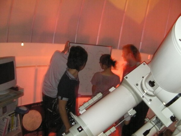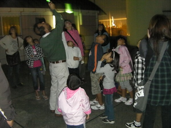 9月25日 西与賀町コミュニティーセンター(佐賀市天文台) 北川副町地域の児童学習会 一般観望会に加え、北川副町地域の児童学習会の天文教室がありました。副島氏が講師で19時より2階の学習室が満杯の状況で始まりました。最初一般観望会は、雲の間から月や木星が見える程度でしたが次第に晴れてきました。20時頃には児童学習会の皆さんが屋上に上がって来られたので一般来訪者と一緒になって大混雑で20cm屈折、大型双眼鏡2台、双眼鏡15台、25cmドブソがフル稼働でした。雲・月明かりのため観望対象が少なく「月・木星・天王星・アルビレオ・ことα、β・いるかγ・M57」等でした。 訪者約32名 児童学習会60名 担当:永渕,近藤, 副島 応援:園田、松本、松尾、太田(佐賀大) 写真1、2、3、4 |