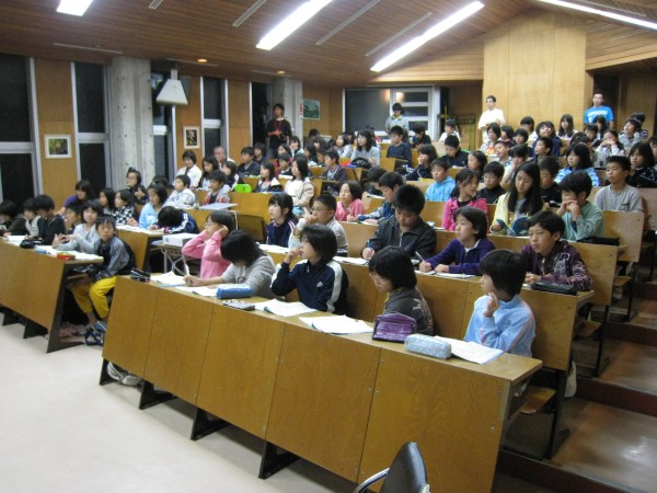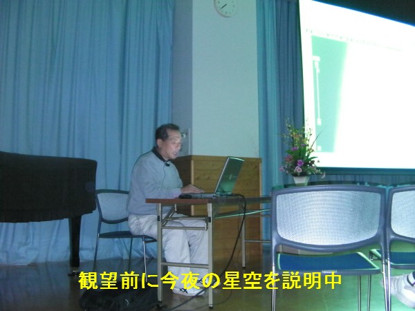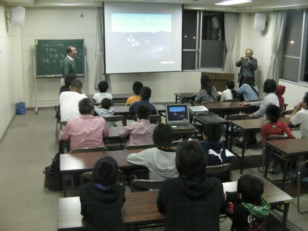 9月29日 北山少年自然の家(福岡市立七隈小学校) 雨は降らなかったけど曇天で晴れる見込みがなかったので、視聴覚室でステラナビゲータによる本日の星空の話(松林)と、月、宇宙の大きさなどの話(近藤)をしました。 参加者:約90名 担当は、近藤、松林 写真1、2 |