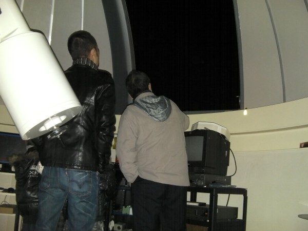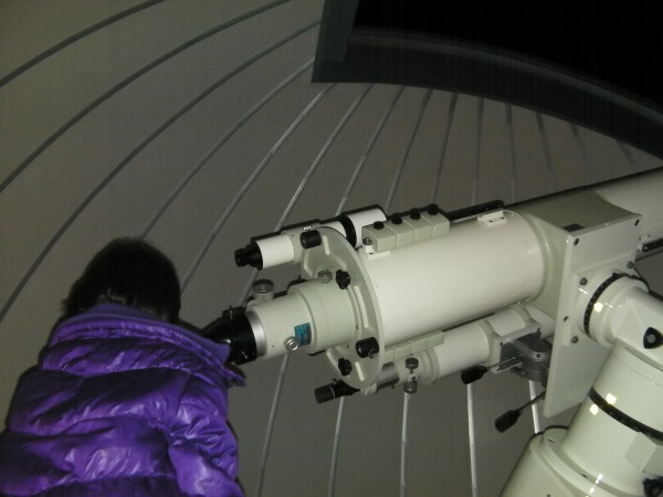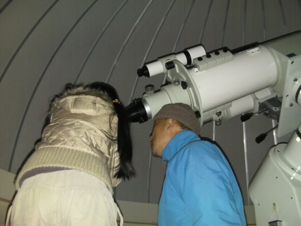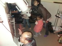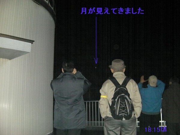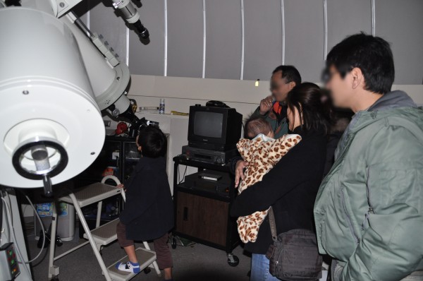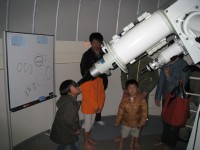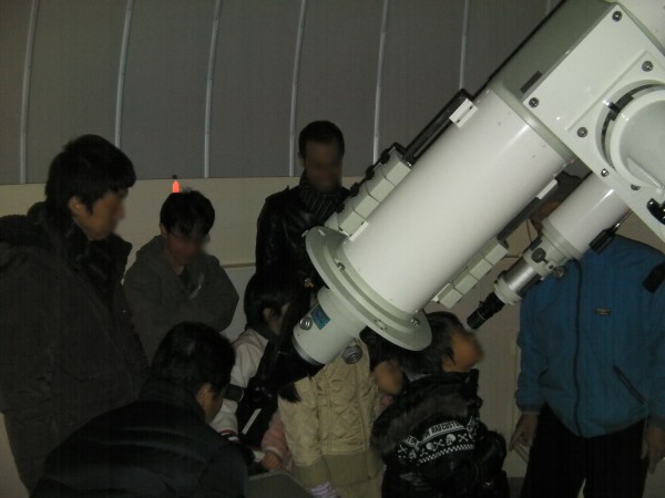 12月18日 西与賀町コミュニティーセンター(佐賀市天文台) 天気は快晴で、この時期としてはシーイングも良く、木星、天王星は、20cm屈折で400倍でもなんとか観望できました。ほかに月、アンドロメダγ、二重星団、NGC457、ウサギ座R、M42などを観望。満月前の月は、双眼鏡で来年の干支である「うさぎ」を確認してもらいました。また、月、二重星団、ウサギ座R、M42などは、20cm屈折にターレットを付けて40cm2インチアイピースでも観望しました。(アメリカンサイズの減光フィルターが行方不明です) 来訪者:5家族で約15名 担当:園田、松林、佐賀大(太田) 写真 1 |