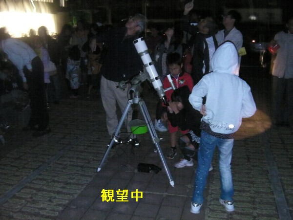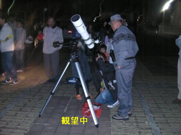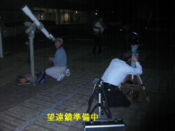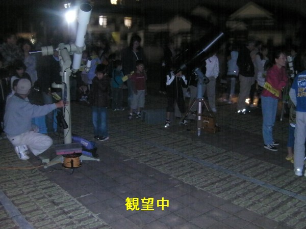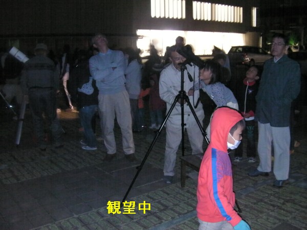 10月16日 大和生涯学習センター(ウェルネス大和) 19:30より、まず室内で今夜の星空を事前説明を行いました。その後、駐車場広場に移動して星空観察を行いました。少し薄雲が広がってましたが望遠鏡4台、双眼鏡2台で木星、月、アルビレオ、M31を観望。ほか、星座の説明やデジカメや携帯での撮影も行いました。再び室内へ戻り「質問タイム」で色々な質問がありました。21:30に終了。片付け途中でハートレー彗星を探しましたが確認できませんでした。 写真1、2、3、4、5、6、7、8 ビデオ 来訪者88名 担当:鶴田,近藤,永渕,小柳,内川,副島,(Photo松尾) |