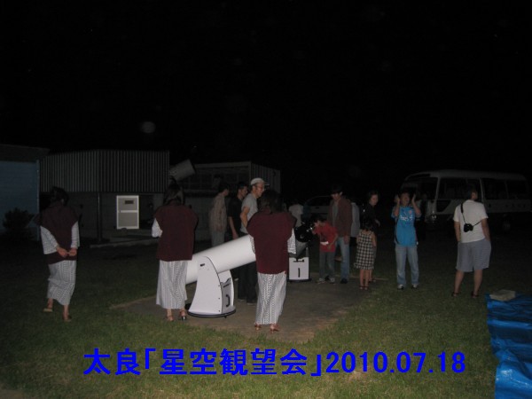 | 写真はありません。 | 8月14日 太良観望会(太良旅館業組合様「星空観望会」) 8割ぐらい雲で望遠鏡は使えませんでした。すき間から見える星座をグリーンレーザーを使って解説、双眼鏡でミザール、アルビレオを観望。最後あたりに少し晴れて、M6,M7を観望。参加者に喜んで頂きました。 参加者は20名ほど+旅館スタッフ5名 近藤、園田の2名で対応しました。 |