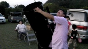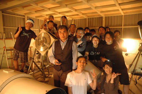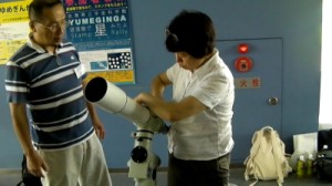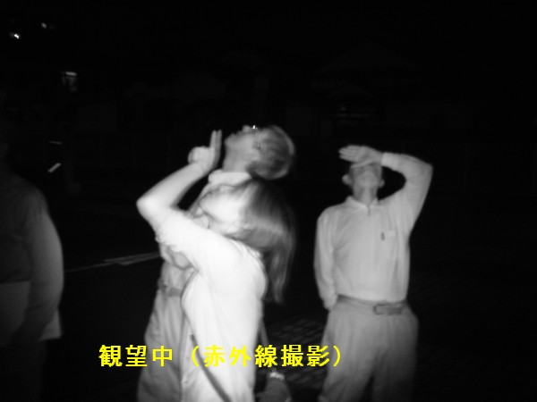 8月13日 太良旅館組合 参加者が到着されたときにISSが北東の低空にまだ見えていたので、急いでマイクロバスから降りてもらい見てもらいました。その後、土星が西空の低い雲の上に見えていたので、26cm反射で観望してもらいました。ときどき低い雲が流れていく天候でしたが、60cm反射(ろくまるくん)でM13、FUJINON双眼鏡でアルビレオ、デネブ付近の天の川や満月直前の月を見てもらいました。また、ペルセウス座流星群を2個ほど見ることができました。 写真 1,2,3 参加者 13名+旅館スタッフ2名 松林、近藤で対応。 報告:松林 |