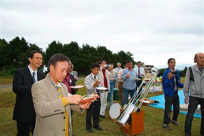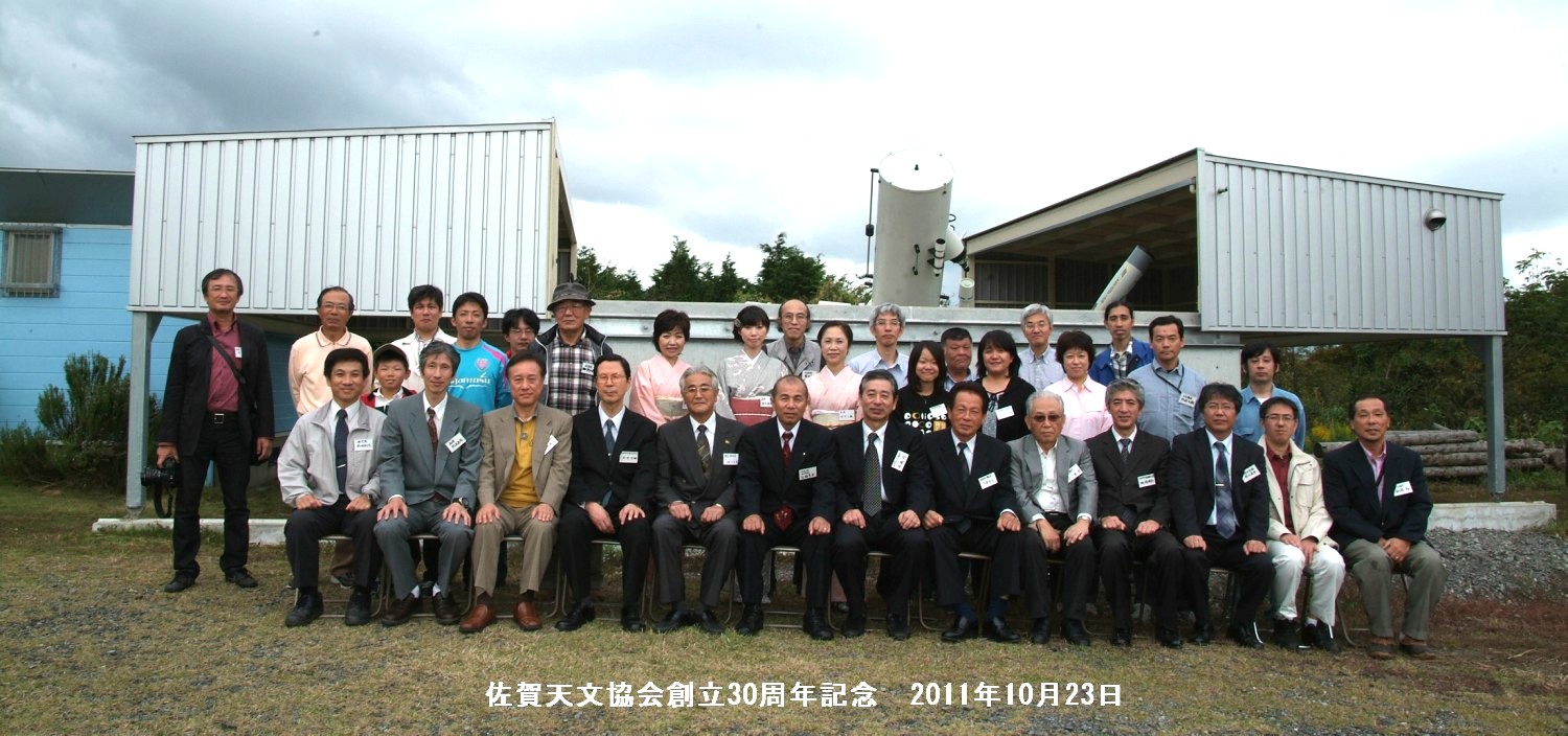 10月23日 創立30周年記念式典 (太良観測所) 前夜祭に続いて本番の式典日は曇りでした。昨日から泊まり込みの会員によって朝か会場設定が完了しました。10時過ぎには来賓の方も到着されて、予定の11時から近藤会長の式典挨拶が始まりました。その後、ご来賓の方々から祝辞をいただき、ほか来訪いただいた方の紹介がありました。許斐氏による導きで乾杯。プロジェクター投影の関係で観測所内に全員詰めていただいて、山田顧問による「佐賀天文協会の30年のあゆみ」と題して記念講演を行っていただきました。その後、外で集合写真を撮りました。記念パーティーは太良名物の「竹崎カニ」をいただきました。川島会員によるカニの食べ方実演があり大変わかりやすかったです。もちろん、茹でたてで大変おいしかったです。それぞれで話がはずんで良い雰囲気でした。後片付けも終わり、ほっと一息の近藤会長が拝見できました。皆様のご協力で終了することができました。 ビデオ→ 写真→1、2、3、4、5、6、7、8、9、10 、11 報告:松尾 |