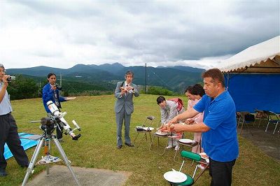 7月23日 太良旅館組合 観望会開始のころは、靄がかかったような状態で遠くの街明かりが上空まで上がっていましたが、シーイングは比較的良い状態でした。26cm反射で土星、ろくまるくんでM13とM57を観望。空の状態は少しずつ良くなり、観望会が終わるころには天の川も確認できるようになっていました。 写真 1、2 参加者 12名(うち子ども2名)+旅館スタッフ2名 副島、福田(有田)、太田、松林で対応。 報告者:松林 青森県弘前市から日食ツアーに参加されている坂本隆さんと、福田さんの職場の後輩、太田さんの友人が参加。 |