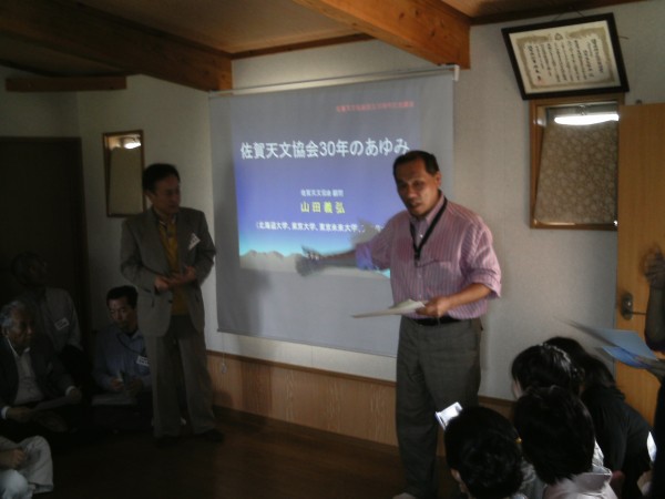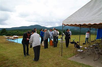 10月22日 創立30周年記念式典 前夜祭(太良観測所) 観測所で14時過ぎから会員によってテント張りやBBQ、副食材の調理がはじまりました。途中で小雨が降り外での開催が危ぶまれましたが夕方からだんだん天気がよくなりました。18時頃から近藤会長の乾杯に始まり、挨拶では会員の絆の大切さや、これまでのように色々な天文スタイルの会員がそれぞれの得意分野で協力しあって運営して行き、もっと天文協会が発展するようにしましょうとの話がありました。宴も進むとかなり酔っぱらった会員もいまして、大盛り上がりでした。その後室内で「天文協会30周年」を振り返るビデオを上映しまして昔の記憶を呼び戻してもらいました。外では、いつの間にかに空の状態が良くなり、「オリオン座流星群」を観測する人やろくまるくんを操作して観望する人が現れ、天文協会員らしいところを垣間見ることができました。夜遅くまで続いたので明日の記念式典本番に差し支えなけ良いのですが・・・。 ビデオ→ |