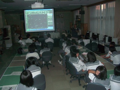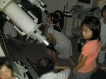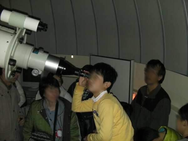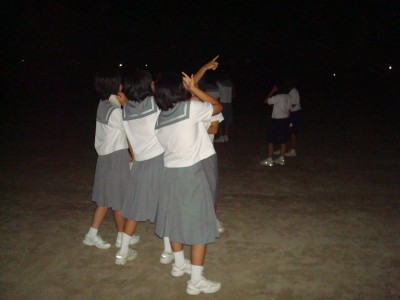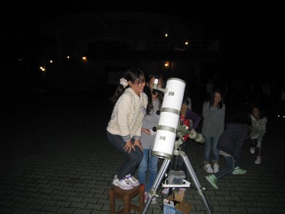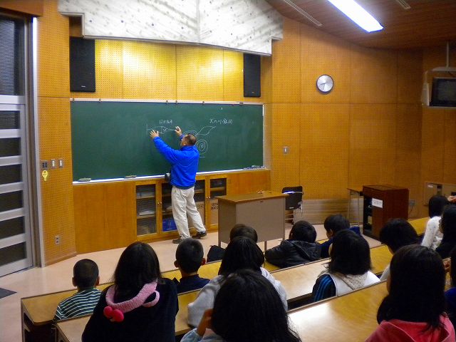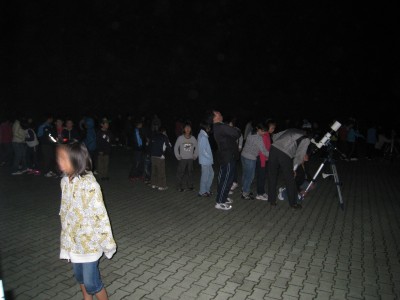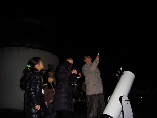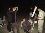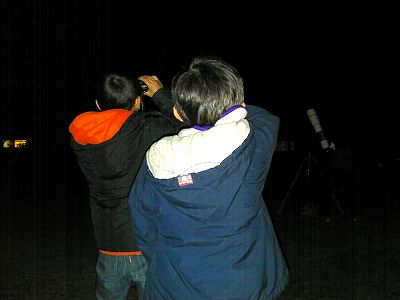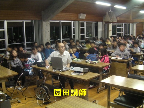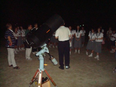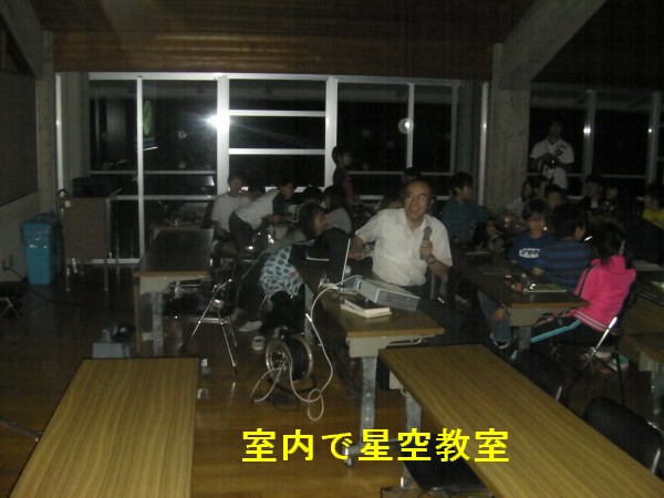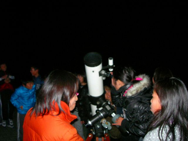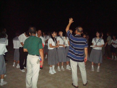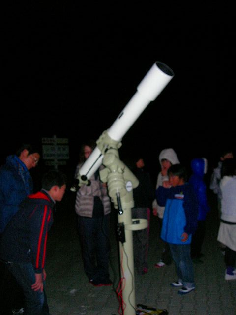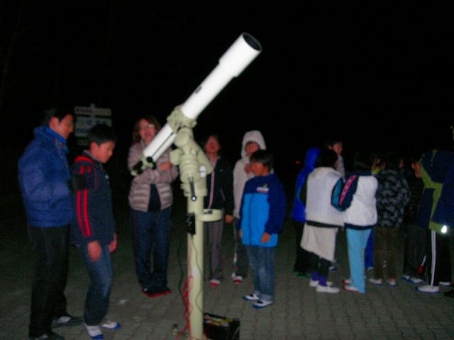 11月16日 蓆田(ムシロダ)小学校・ (北山少年自然の家) 当日は水星観測を18時10頃までした後で、北山へ急行しました。19:00頃に到着、既に大田さんは到着済みで、早速観測場所を決め望遠鏡のセッティングをしました。 シーイングは良くありませんでしたが、透明度は抜群で天の川も楽に確認できました。19:30からステナビで今日の星空の紹介をし、眼視で夏の大三角天の川、夏の星座、秋の星座、ペガススの四辺形、の確認、望遠鏡では、木星、アルビレオの観望をし、20:30から教室に戻り質問やシャンケン大会で盛り上がり21:00に無事に終了しました。子ども達は大変素直で好感の持てる雰囲気でした。 写真 1、2、3、4 対象者:76名 担当:副島、大田 写真:副島、大田 報告:副島 |