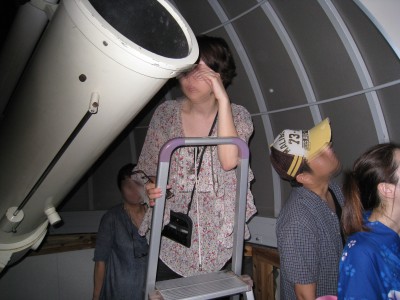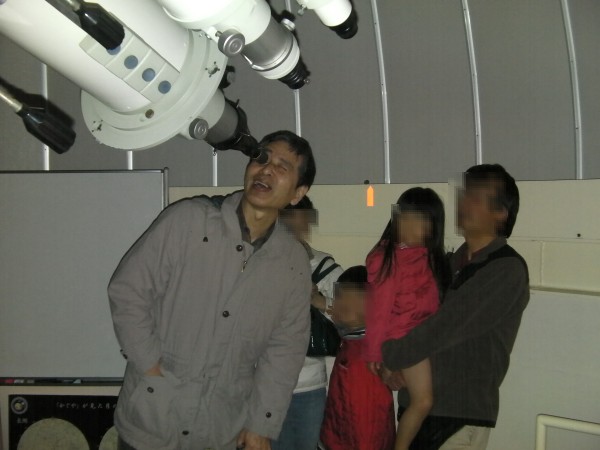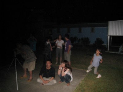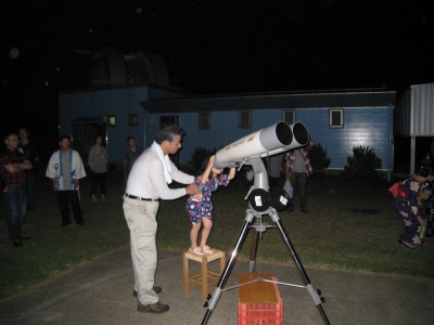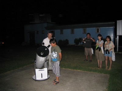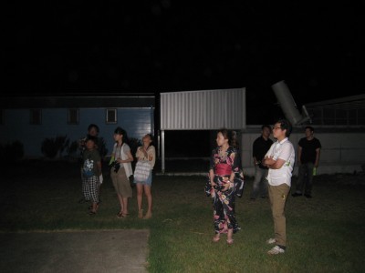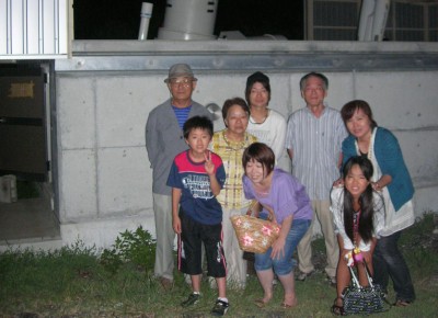 8月20日 太良旅館組合 20日の太良は天気不純でしたが、大人6名子ども2名の8名参加で催行しました。 総て「蟹御殿」のお客様で星が見えずとも観測所が見たいとのご要望と言う事で、鶴田顧問と私で対応しました。天気は良くありませんでしたが、時折雲の合間から星がのぞき、アルビレオのみ観望して貰いました。 僅かの合間から、人口衛星が見られ喜んで貰いました。 みなさん、天気の良い時にもう一度来たいと言われておりましたので、「また蟹を食べに来られた時は、是非来てください」と伝えております。 写真 1 参加者 8名(うち子ども2名)+旅館スタッフ 副島、鶴田で対応。 報告:副島 |