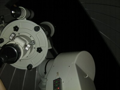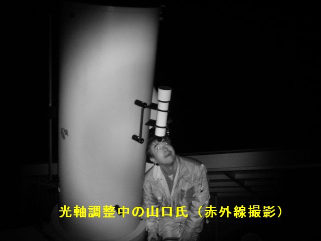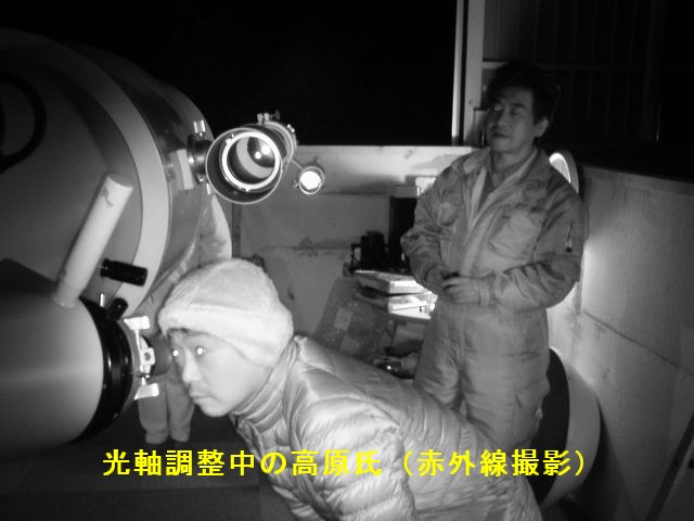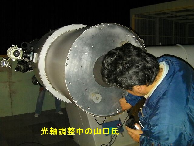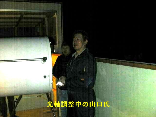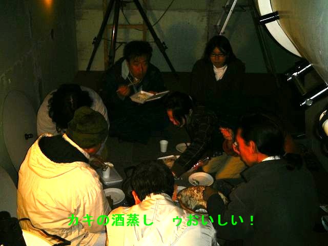 11月23日 太良観測所整備・ろくまるくん整備&天文講座 14時過ぎに観測所に着いたところ「とくまるくん」のスライディングルーフが少し開いていました。閉め忘れのようです。いつから開いていたかわかりませんが赤道儀が雨で濡れていました。内部にも金魚が飼えるくらい水が溜まっていました。電磁クラッチを分解して調整しましたが未だ思うような状態では有りません。一応、バランスがとれた状態では自動導入は可能です。そんなこんなで16時過ぎに近藤会長と長崎の山口氏、高原氏が来られました。山口氏は光軸調整を行っていただきました。変な光学系をしているので調整は複雑の様でした。かなり追い込んでもらっていますので良くなっていると思います。大変ありがとうございました。暗くなってきたころから副島氏が講師で開催中の天文講座の生徒さんが14名ほど来られてカニパーティーが始まりました。天気があまり良くなかったのですが雲の隙間から見える木星を観望していただきました。一方、澁谷さんがお店からもって来られたカセットコンロでカキの酒蒸しを作ってもらいまして、おいしくいただきました。福田氏が調整中のsoftbankホームアンテナは機器の不具合でまだ未開通です。23時過ぎに撤収しました。 写真→1、2、3、4、5、6、7、8、9 光軸調整:山口氏、高原(長崎) 参加者:近藤、副島、福田、古川、澁谷、松尾 報告:松尾 |