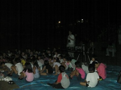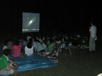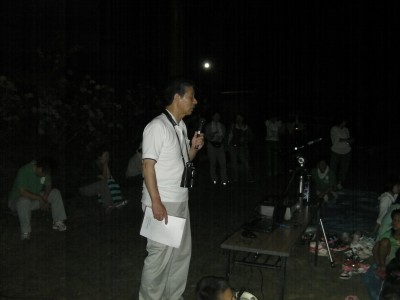 8月6日 佐賀市三瀬村(山中キャンプ場) 日没後すぐの頃は月が雲越しに見ることができましたが観望会開始時刻の21時にはすっかり見えなくなり観望は出来ませんでした。広場で予め用意していたプロジェクターとパソコンで星空講演を近藤会長が実施。本日の星空の説明から始まり夏の大3角の星座の説明、今日はちょうど伝統的七夕の日だったので七夕の話や天の川と銀河の話などでした。国立天文台の「Mitaka」ソフトを使った宇宙旅行を疑似体験してもらい宇宙の広がりを感じてもらえたと思います。後半に小雨が降ってきたので少し早めに終了しました。 写真 1、2、3 参加者:41名(小1〜小6) ボランティア中学生5名 保護者3名 実行委員スタッフ16名 計65名 担当:近藤、松尾 報告:松尾 |