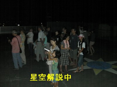 7月23日 西与賀町コミュニティーセンター(佐賀市天文台) 天候:晴れ 透明度:6/10 シーイング:5/10 対象:土星、M7、M8、アルビレオ、こと座ε、β、M57、M13、ラスアルゲティ 夏休みで子供たちの来訪が多く賑わいがありました。近藤氏が屋上広場で25cmドブソと大型双眼鏡で星空解説。20cm屈折では永渕氏が土星を導入。帰る頃にどうにか肉眼で天の川が確認できる状態でした。 写真→1、2 来訪者 27名 当番:永渕、近藤 +松尾 |