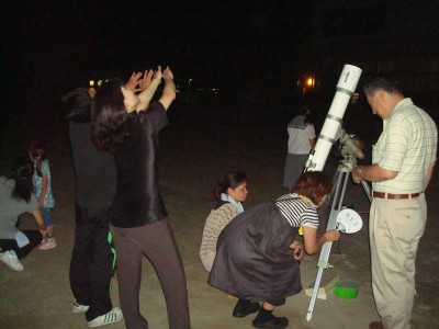 9月23日 開成公民館:「お月見会」 お月見会でだんごを作り、お茶を点てていただく催しの中の星空観望コーナー。月齢25の日にお月見とは・・と思ったが、台風一過の抜群の星空だった。開成小学校の15センチ双眼鏡、と28センチシュミカセに行列できる賑わいで、主催者の話では、予想外に人が集まり、星団や二重星、木星などを初めて見たという人が多く、たいへん喜んでいただいたということだった。15センチ双眼鏡の移動が老体には大変だったが、その甲斐はあった。 対象:M7,M8、M11、M13,M22、ミザール、アルビレオ、ラス・アルゲティ、M31、木星、夏から秋の星座 写真はありません 対象者:60名 担当:近藤、園田、大田 報告:近藤 |