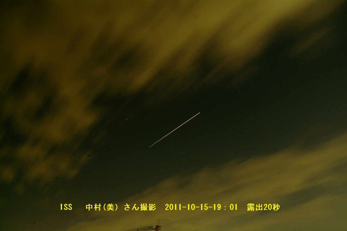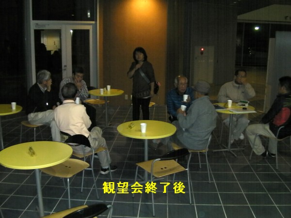 10月15日 佐賀市大和町観望会(ウエルネス大和) 開始の予定を早めにして最初は外で18:40過ぎからISSの観望を行いました。夕方から曇り空だったので観望は難しいと思っていましたが、ちょうど雲が切れたところからISSを見ることができました(写真2)。来訪者全員が見れて良かったと喜んでもらえました。その後、会館内に戻って近藤会長の挨拶から副島氏による天体写真の投影、今日の星空説明、質問タイムを実施。その後は外で観望会を行いました。雲の間から低高度の月や木星を観望。最後はデジカメ撮影にも試してもらいました。意外に気温が低くて寒かったのですが、観望会終了後、主催者さんのご厚意でコーヒーをサービスして頂きまして、参加した会員が和んで終了しました。 写真→ 1、2、3、4、5、6、7 来訪者:約50名 参加者:椛島、近藤、鶴田、永渕、小柳、中村(美)、大田、副島、松尾 報告:松尾 写真2提供:中村(美) |
