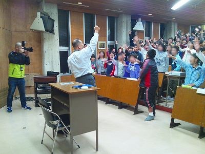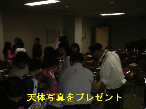 10月20日諸富公民館通学合宿観望会(諸富小44.5.6年生) 昼間は晴天だったが夕方から天気が悪くなり、曇りで室内での星空教室となりました。21j時開始予定から少し遅れて始まりました。入浴後の天体教室だったので、すでに眠たそうな様子で講師の副島氏が話術で盛り上げてどうにか出来ました。内容はステナビで星や宇宙人のはなしなどで、「星の数」の話の時に「一,十,百,千,万 ・・・・ 不可思議,無量大数」と、すべて暗唱できる小学4年生の女の子がいました。最後に質問タイムでは質問者ゼロでなんとなく終了。帰り際に「天体写真」を全員にプレゼントして終わりました。8月に三瀬の山中キャンプ場での観望会に参加していた小学生もいました。 写真 1、2、3 参加小学生33名 担当:近藤、副島 取材報告:松尾 |