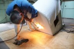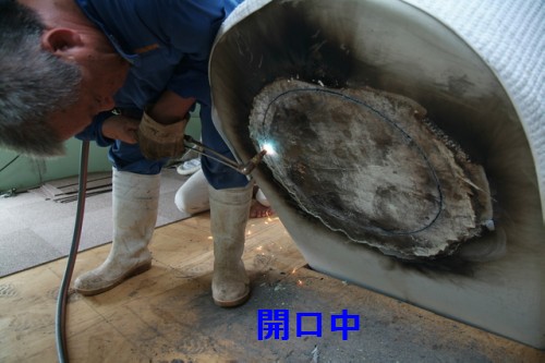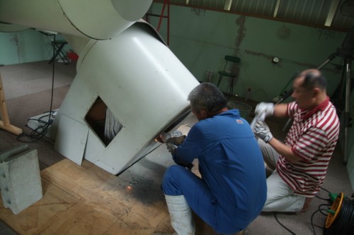 9月2日 太良観測所 ろくまるくん整備 電磁クラッチ整備が容易に出来るように、赤道儀に点検口として開口作業を行いました。開口作業はアセチレン・酸素ガス切断の作業資格が必要なので、福岡建設様のご協力で作業員さんを派遣していただきました。外部塗装が厚く、先ず塗装除去作業が必要でした。また、切断時の火花避けと高温による温度歪み防止のために厳重な養生も行いました。約400mmφの開口が出来ました。なお、この開口による赤道儀の強度低下の懸念がありますが事前に天文ハウスTOMITA社長さんと相談して影響は軽微だろうとの判断の下で行いました。 写真→ 1、2、3、4、5、6、7、8、9、10 、11、12 作業者:近藤、副島 + 福岡建設の作業員さん |