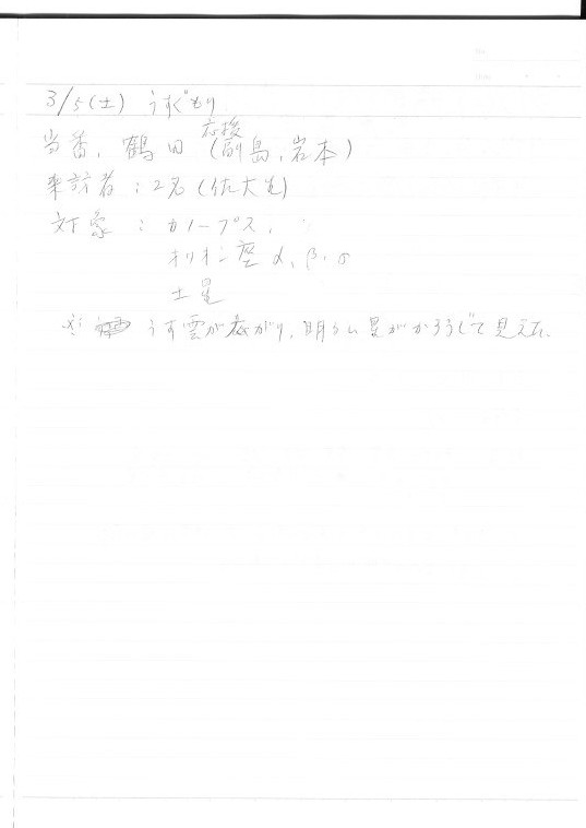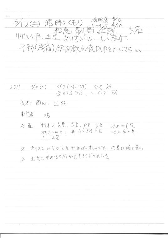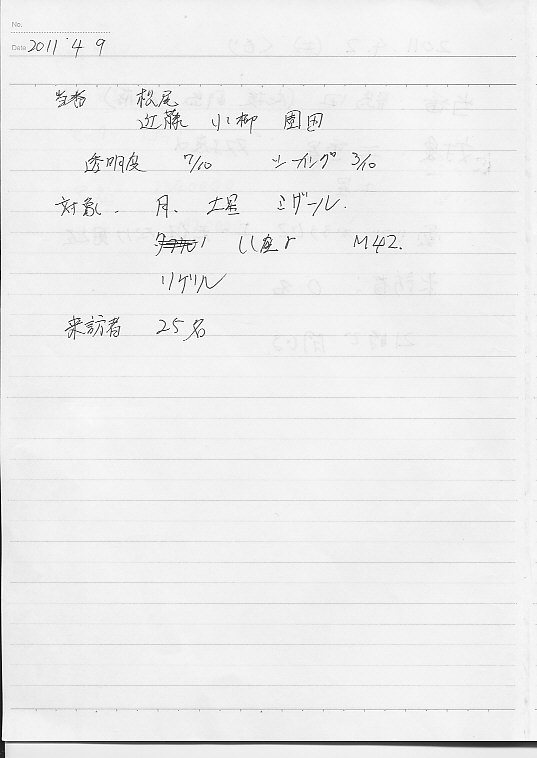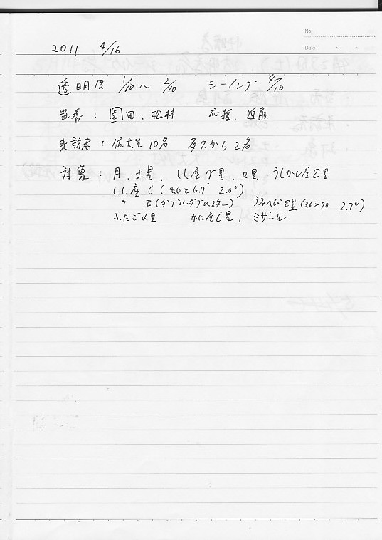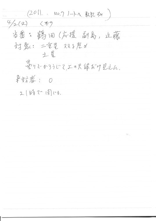 | 2011年4月 | 2日(土) | 天体観望会(一般向け) | 佐賀市西与賀コミュニティーセンター | 第1週 記録ノート画像 | 終了 | 鶴田、,副島、近藤 |