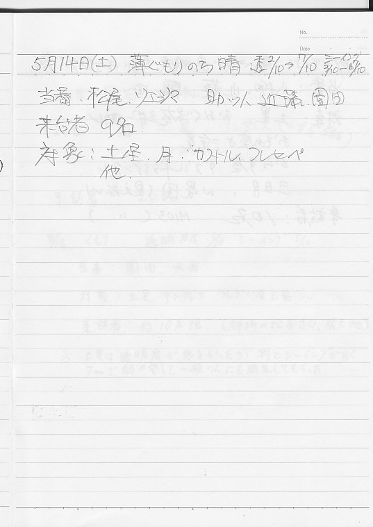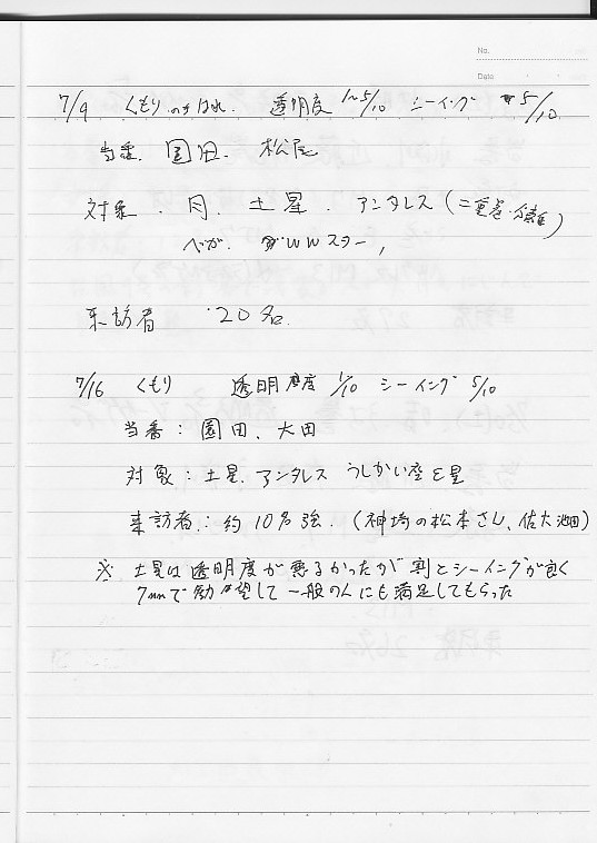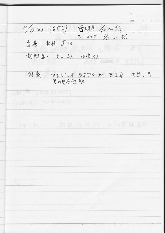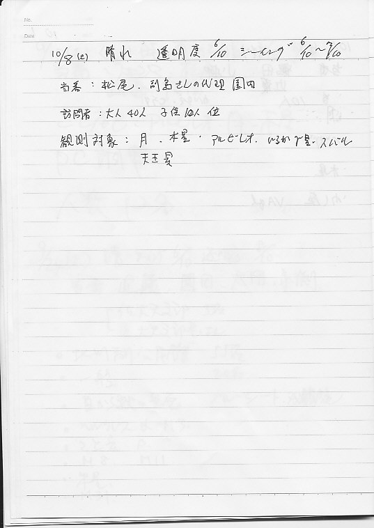 | 天体観望会(一般向け) | 佐賀市西与賀コミュニティーセンター | 第4週 記録ノート画像 | 終了 | 近藤,永渕、大田、佐大医生1名、佐大生3名 | ||