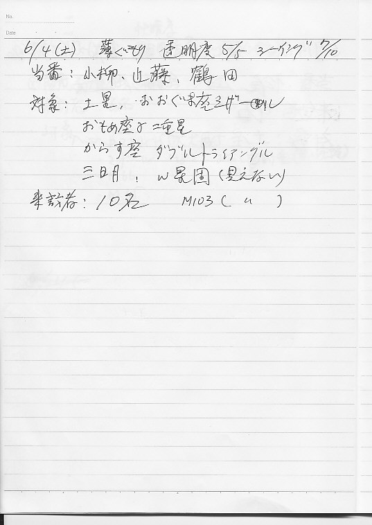 | 2011年6月 | 4日(土) | 天体観望会(一般向け) | 佐賀市西与賀コミュニティーセンター | 第1週 記録ノート画像 | 終了 | 鶴田,小柳、近藤 |