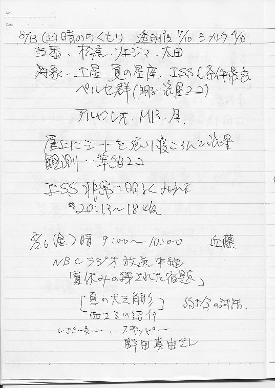 | 天体観望会(一般向け) | 佐賀市西与賀コミュニティーセンター | 第2週 ペルセウス座流星群観測 記録ノート画像 | 終了 | 副島、松尾、太田 | ||