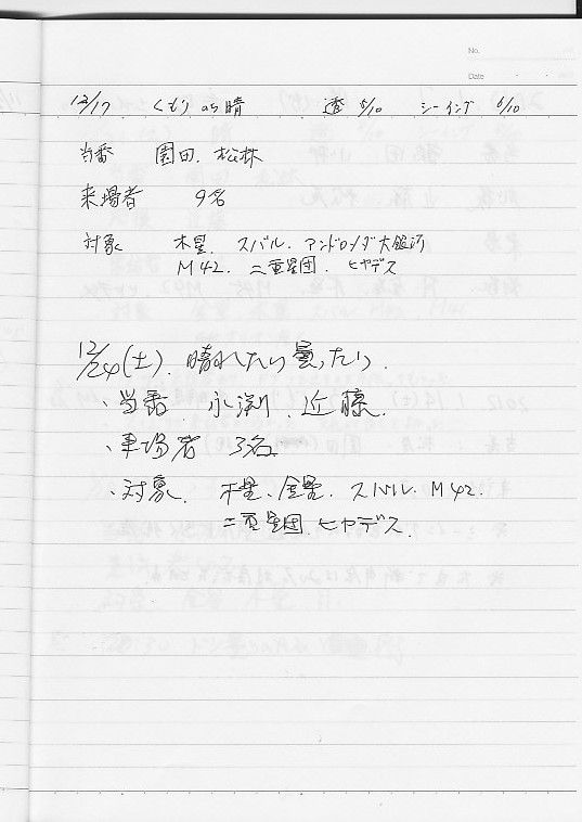 | 2011年12月 | 3日(土) | 天体観望会(一般向け) | 佐賀市西与賀コミュニティーセンター | 第1週 防水工事でドームが使用不能 記録ノート画像 | 終了 | 鶴田,小柳+近藤。松尾 |