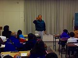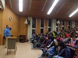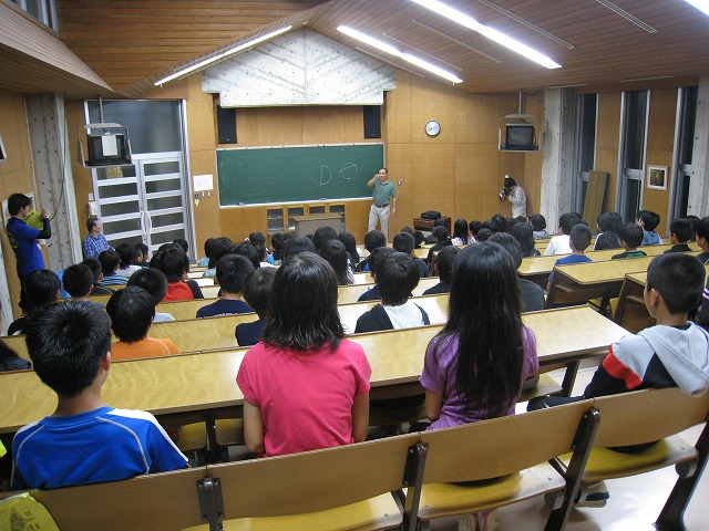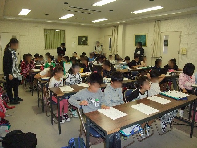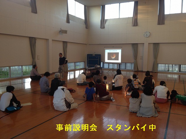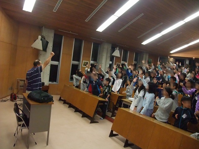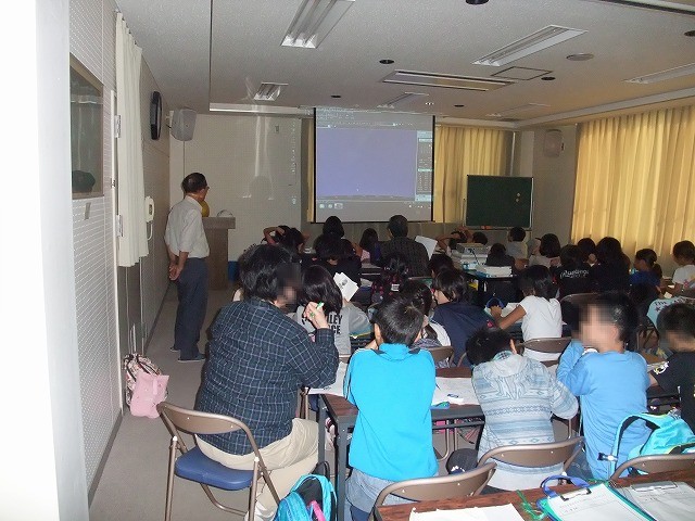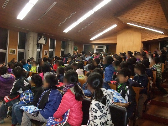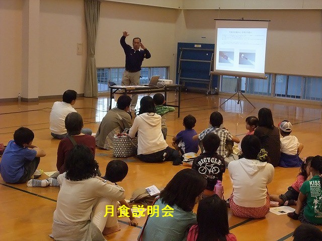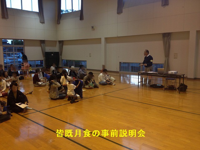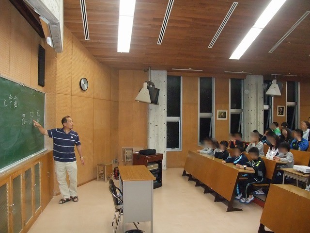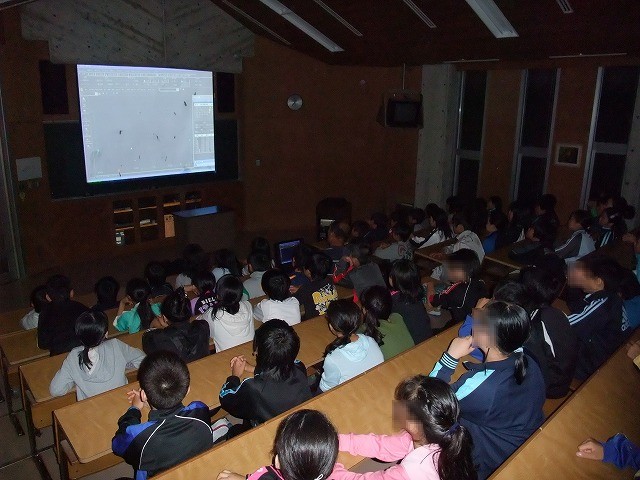 10月1日 大楠小学校様 北山少年自然の家 晴れていれば上弦の月と西空の土星を観察する予定でしたが、曇天のため屋内で映像と話で行いました。最初に近藤がステラナビで今日の星空の案内をしました。南西に低いさそり座と火星と土星、天頂の夏の大三角、北の北斗七星とカシオペアからたどる北極星、東のペガススの四辺形などです。 次に南天の半月が時間と共に西に沈んでいく日周運動を確認し、次に日没の時間に日を追って三日月から満月へと位置と姿を変えていく姿を太陽との位置関係で確認しました。8日の満月が欠けていて変だということから、皆既月食の話に移りました。東から出た満月が日周運動で時間と共に上がりながら食が進行していく姿を確認し、次に月を中央に固定して食の進行を背景の恒星と共に見ていくと、月が公転運動で東に移動しながら地球の影の姿を描き出しながら移動いくことを確認しました。 さらに地球・月・太陽の大きさと距離や宇宙の姿の話や美しい天体写真をスライドショーで紹介し、最後は副島さんが天体写真獲得じゃんけん大会で盛り上げて終りました。難しい話もありましたが、常に生徒に問いかけ、三択問題で手を挙げてもらうなどして進行したので、最後まで皆集中してくれました。 参加者 5年生生徒51名、先生6名 担当:近藤、副島 報告:近藤 写真:近藤 写真 1 |