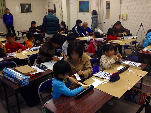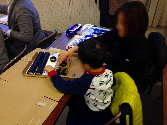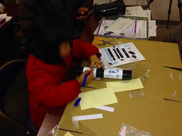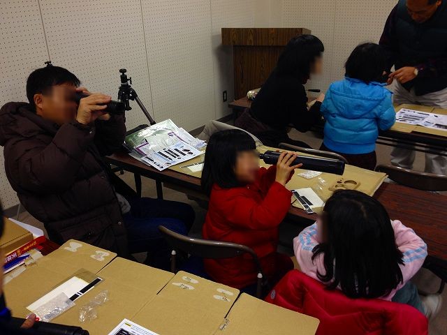 1月11日 「冬休み天体教室,第2回目」(西与賀町コミュニティーセンター) 佐賀市教育委員会主催の冬休み天文講座「望遠鏡のしくみと冬の星座」2回目です。今回は望遠鏡作りでした。17時開始でしたが、少し遅れて開催、最初に佐賀市の担当の人から開始の挨拶があり、講師の副島さんの紹介がありました。さっそっく望遠鏡作りにかかりました。小さい子供さんが多かったので、ステップごとに全員の制作を同期して行いました。サポートに近藤会長と報告者が回りお手伝いしました。10分で完成する望遠鏡キットが、30分くらいかかりました。お父さんお母さんの頑張りもあり無事に出来ました。完成後、作った望遠鏡を持って全員で集合写真を撮りました。屋上広場に出て、さっそっくのぞいて見ました。月齢10くらいの月に合わせてクレーターを見たり、木星の観察もできました。月明りで見つけにくいスバルも自分で導入出来た子供さんもいました。簡単な望遠鏡キットですが、親子で協力して作り、天体観察したことは思い出に残るのではないでしょうか。みなさん、楽しそうでした。18時30分過ぎには自由解散して終わりましたが、引き続き定期観望会に参加される方もありました。 観測対象:月、木星、スバルほか 参加者:25名 担当者:副島、近藤、松尾 報告・写真:松尾 写真 1、2、3 、4、5、6、7 |