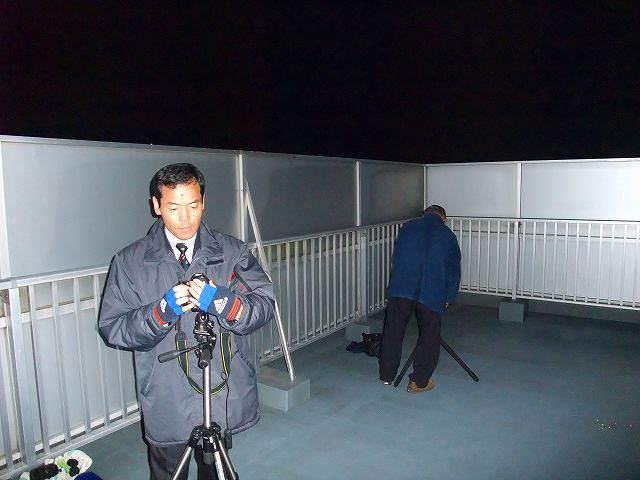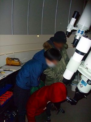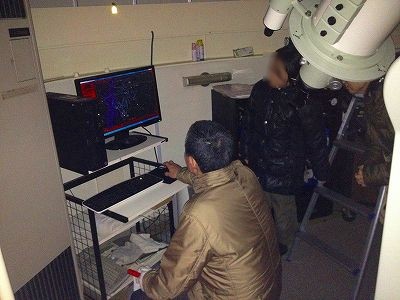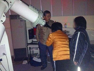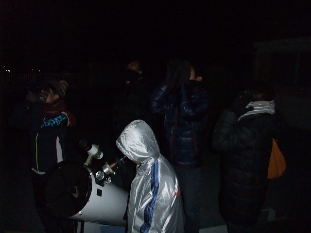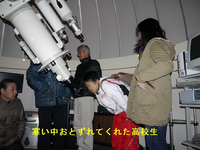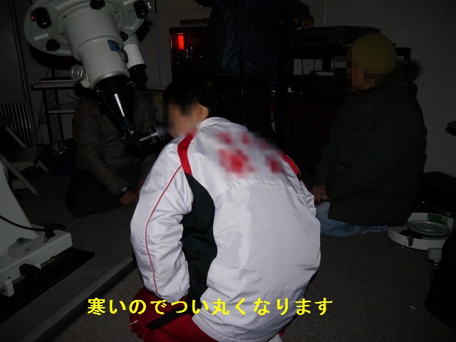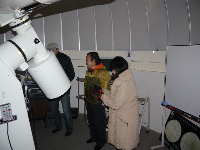 1月18日 西与賀コミュニティーセンター(佐賀市天文台) 観望会が始まる前頃は晴れていましたが、だんだん雲が広がってきました。風も強くて寒かったのでお客さんも少なく西高生の2人連れと常連の1名の3人でした。今日の当番の松林氏は木星の衛星観察をする予定だったのですが雲のためにできませんでした。取りあえず雲のないところで見える範囲の観望会でした。21時過ぎには全天に雲が広がったのでドームを閉めました。その間も、西高生の2人連れは近藤会長の話を熱心に聞いてました。ドーム内温度は5.8℃。少し早く店じまいしました。 観望対象:木星、天王星、うお座α、アンドロメダα 来訪者:3名 担当者;松林 /近藤、大石、松尾 報告・写真:松尾 写真 1、2、3 |