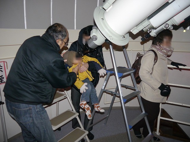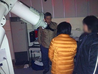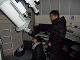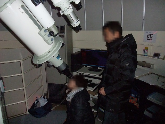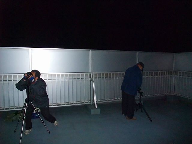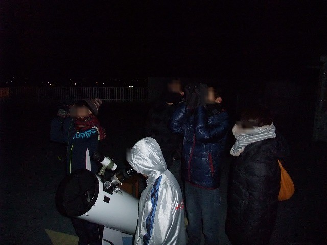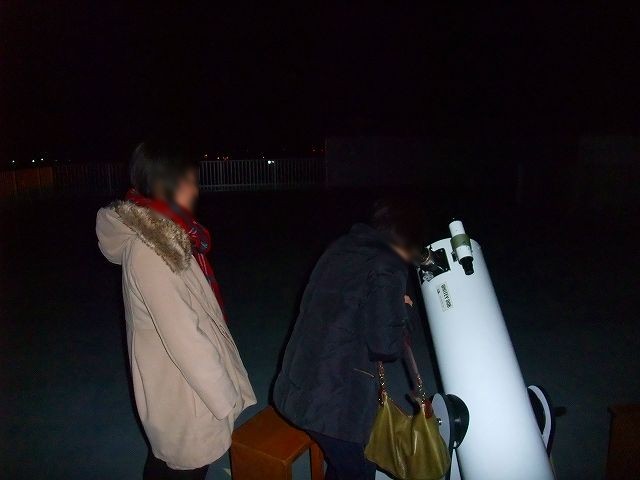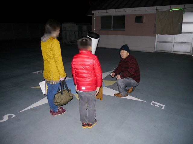 12月20日 西与賀コミュニティーセンター(佐賀市天文台) 夕方は曇り空だったのですが天気予報で夜は晴れとなっていたので、定刻には準備をして待機しました。 観望会開始時刻のころは晴れていたのですが、終始雲の多い天気だったためか定刻を過ぎても来客はありませんでした。近藤会長と話をしていると、20時半過ぎに家族連れが来られたので、雲の合間から見える星や星座を 望遠鏡や双眼鏡で見てもらいました。その後、近藤会長が、屋上広場にドブソを出してすばるなどを見せたり、星座の説明をされていました。終了時のドーム内の温度は、6.2度でした。 観望対象:みずがめζ、天王星、M37、すばる(M45)、M31、オリオン座大星雲、h・χ 来訪者:5名(うち子ども3名) 担当:松林、近藤 報告:松林 写真:近藤 写真 1、2、3、4 |