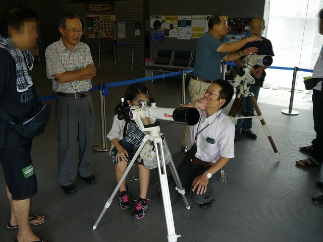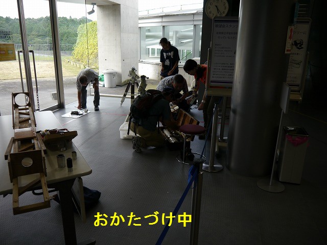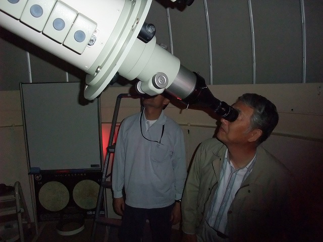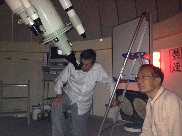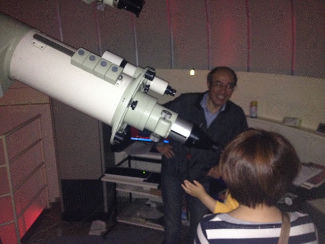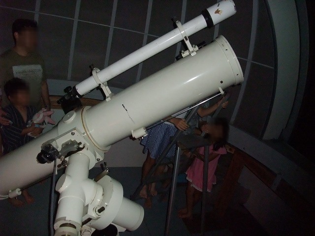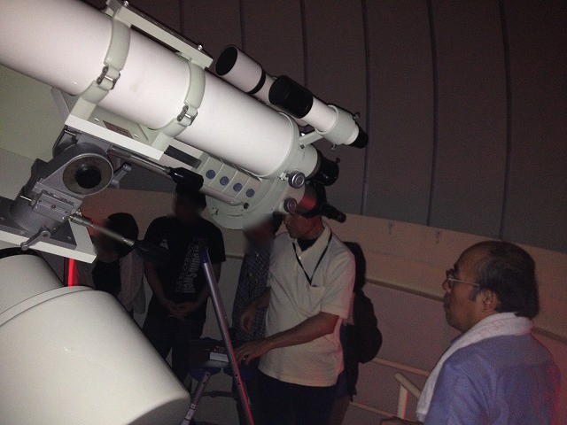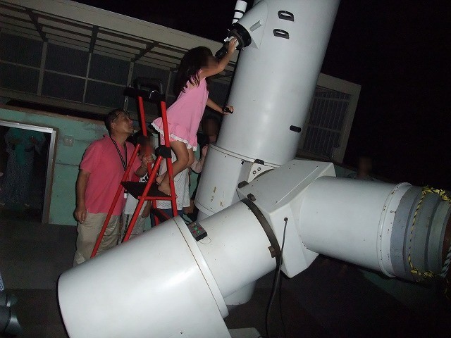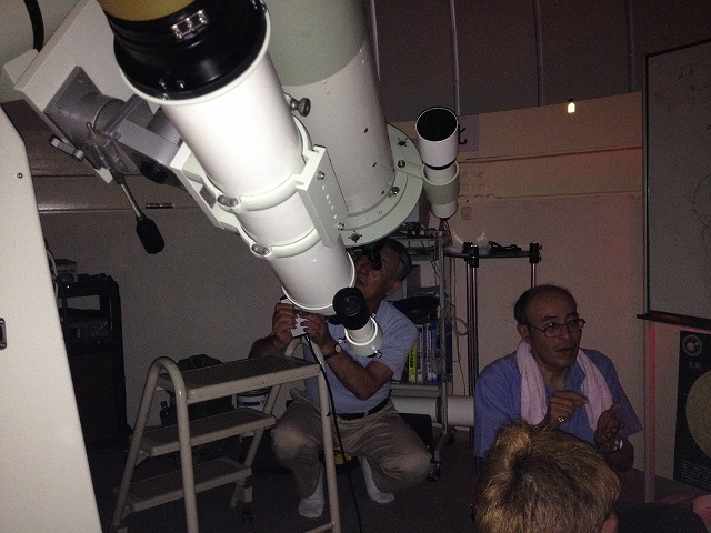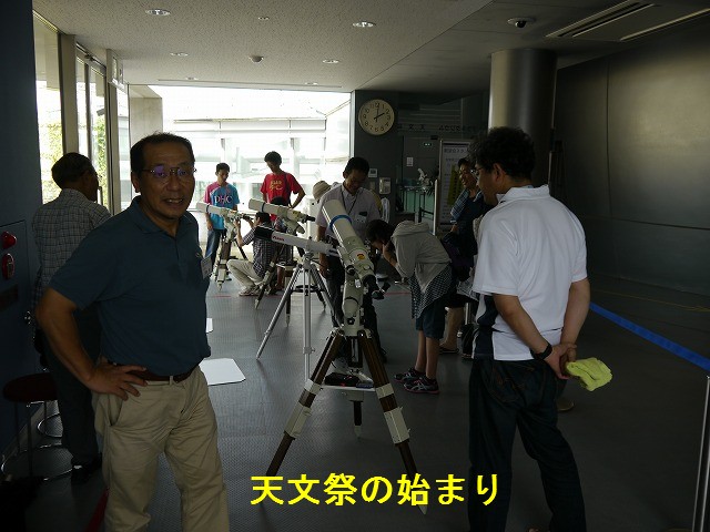8月23日 天文祭2014(佐賀県立宇宙科学館) 今年で5回目になる天文祭です。報告者が着いた時には既に「望遠鏡の使い方講座」と「望遠鏡の分解組立体験」が始まっていてました。使い方が分からないため持ち込まれた望遠鏡はファイインダー調整方法を教えて携帯基地局のアンテナをターゲットにして導入できるように説明が行われていました。望遠鏡の分解・組立体験は仕組みを説明しながら行われるので理解が深まるのと、組立完了時に遠くの風景が望遠鏡で見えた時の感動があり楽しそうでした。説明する担当の皆さんは小さい子供さんが多かったのでゆっくりした言葉でていねいな説明をされたました。磁器鏡望遠鏡の世界的な権威であるスターダスト古川氏が何やら新しい望遠鏡を製作中とのことで見せてもらいました。なんと長焦点屈折望遠鏡でした。対物凸レンズ磨きから始めて木骨フレームで仕上げた力作でした。まだ調整中で見え味は評価できませんが、確かに望遠鏡として機能していますので今後の進化が期待できます。天文祭特別企画のプラネタリウムもみました。プロの天文学者さんと宇宙科学館の解説員さんとの掛け合いで、お客さんとはクイズでの絡みも交えて進行しました。内容は土星以外の星にも円盤があることや、天文学者さんが研究されている天体写真で円盤の中で星が誕生する過程の説明がありました。少し専門的な所もありましたが天文学者さんの説明のため聞いていても安心感がり、ある種の睡眠導入効果があることも発見でした。双眼鏡を持って入ったのでプラネで投影される星空を眺めてみました。感覚ですが10等星くらいの星も投影されているように見えました。星のまたたきは1等星ぐらいのいくつかの星を光量を短時間に変化させているようです。プラネの星は双眼鏡で見ると明るい星は面積があり大きく見える事がわかりました。19:30頃から芝生エリアでは近隣のアマチュア天文家がいろいろな望遠鏡や双眼鏡を出して観望会が始まりました。期待の土星は周辺に雲がかかっていてよく見えなかったは残念でした。ちょうどISSが上空を通る予測だったのでみんなが見守っている中、金星ぐらいに輝いて現れました。一般の参加者も多かったので初めて見た人も多く喜んでおられました。その後も雲が多かったので予定より早く21:30頃、撤収になりました。久々に会う天文仲間も多く来られていて、この天文祭が近隣のアマチュア天文家の集まる催しとして定着したようです。これからも永く続いて、もっと多くの仲間が集まる天文祭になる事でしょう。 担当者:市川、副島、近藤、松林、古川、福田、永渕 報告・写真:松尾 写真 1、2、3 、4 、5、6、7、8、9 、10、11、12、13、14、15 |