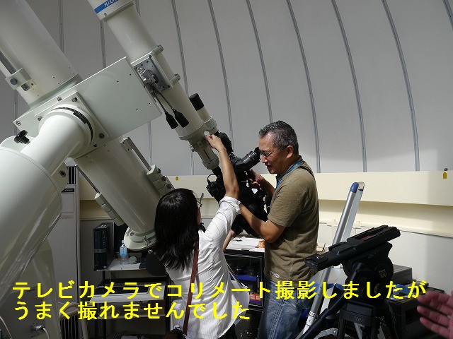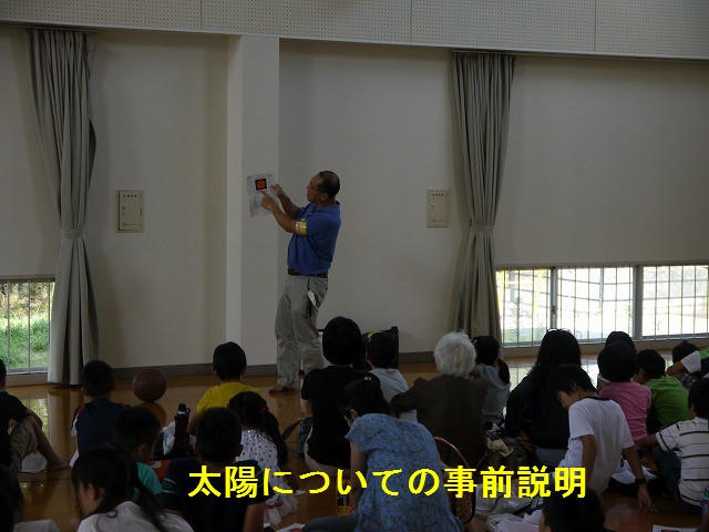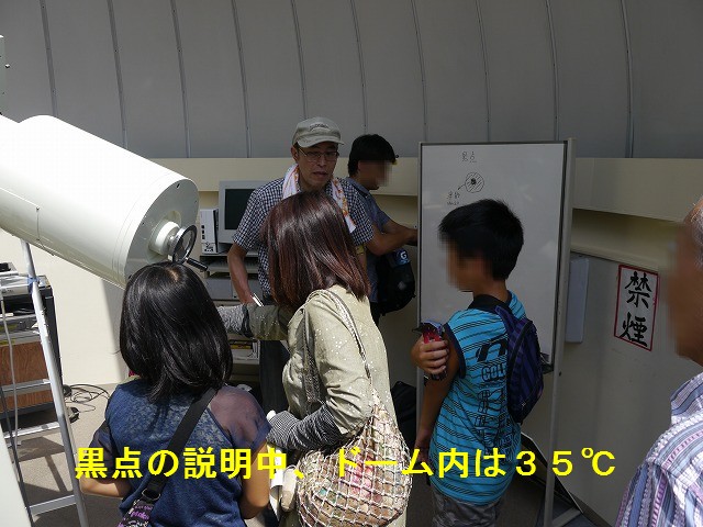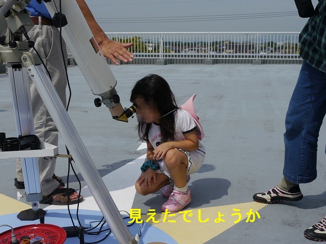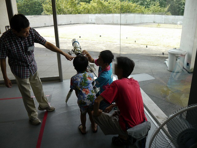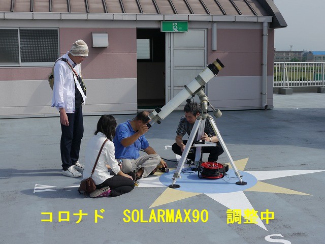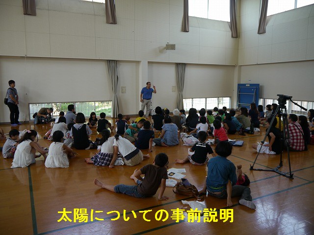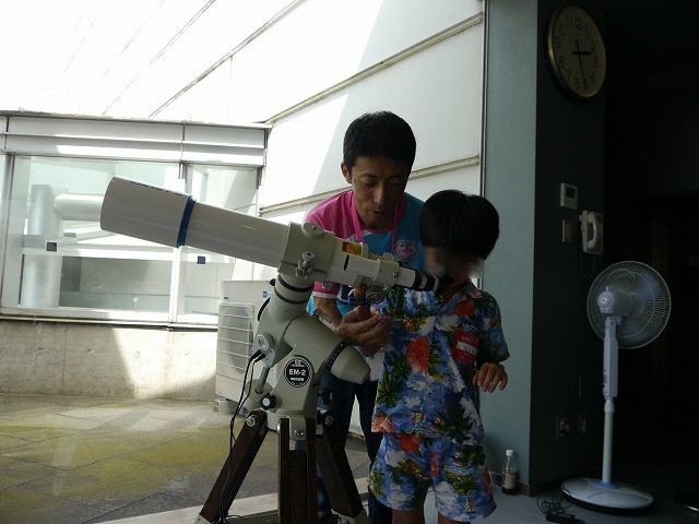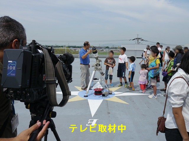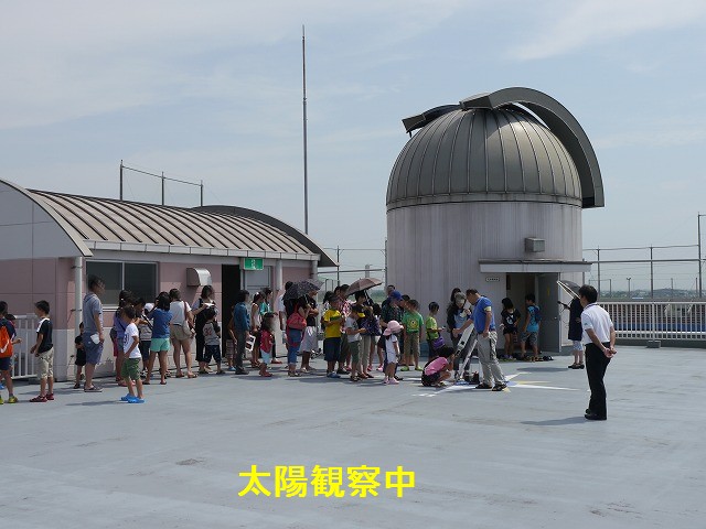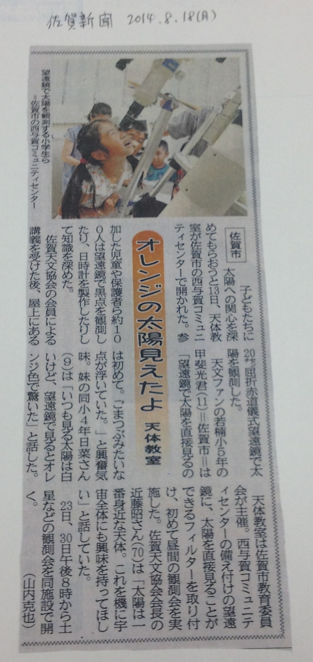 8月13日 [「夏休み天体教室」西与賀コミュニティーセンター(佐賀市天文台) 佐賀市主催で行われた「夏休み天体教室」でした。9時から多目的ホールで太陽についての事前学習が行われました。10時過ぎに新しく購入した太陽プロミネンスアダプター(コロナド社製SOLARMAX90)を使った昼間の観察会を行いました。薄雲が広がる天気でした。そのためかプロミネンスやダークフィラメントを観察するには一般の人には少々難しかったようです。並行してドーム内20cm屈折では太陽投影版にる観察と、12.5cm副鏡では減光フルターによる直視観察が行われました。ドーム内は35℃もあり蒸し暑さが身に堪えました。太陽観察は直射日光の下で行われるので暑さ対策と見やすさの確保が必要なことが分かりました。一通り太陽観察がおわり今度は室内にもどり日時計の工作を行いました。小さい子供さんも多かったので親子で苦労されて製作されていましたが大体完成することができました。帰りに天文協会スタッフにわざわざお礼を言ってくれる子供さんも居て、嬉しいひと時でした。この天体教室の模様はサガテレビさんが取材されていてローカルニュースで放送されました。 観望対象:太陽 参加者:大人44名、子供22名 佐賀市スタッフ:4名 担当者:近藤、副島、園田、市川、大田、松尾 報告・写真:松尾 写真 1、2、3、4、5、6、7、8、9、10,11 新聞報道 |