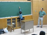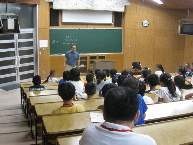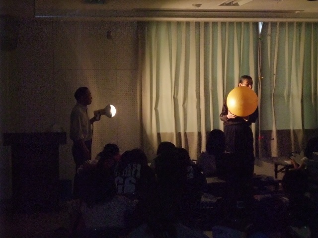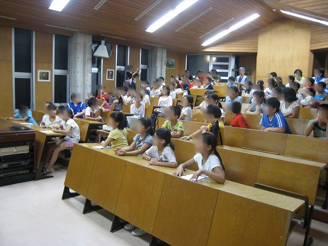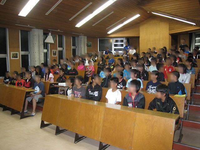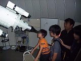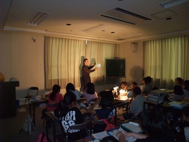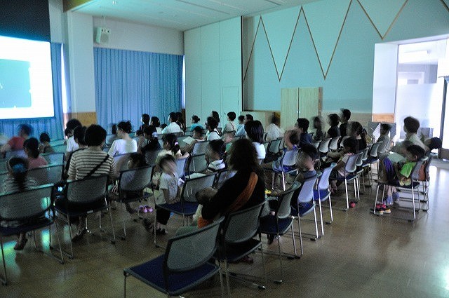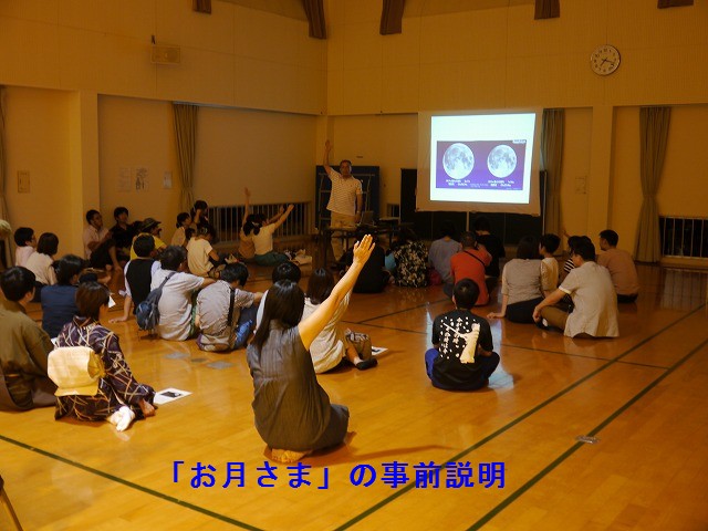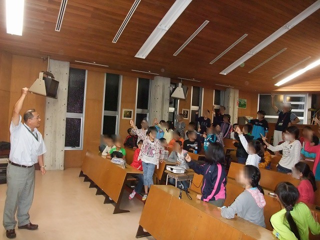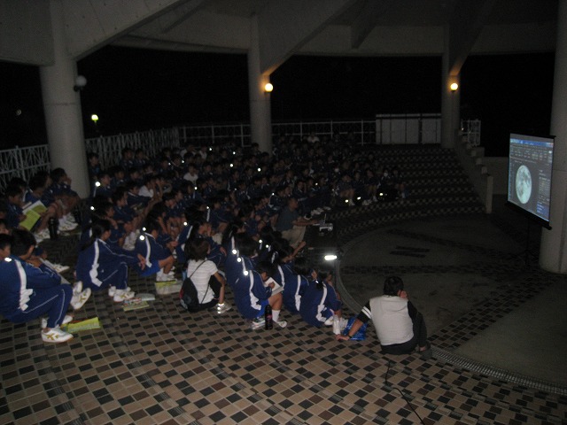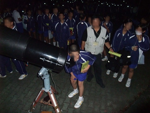 9月2日 月隈小学校様 北山少年自然の家 夜は雨が降る予報で、観望会開始のころは雲が多く月もほとんど見えない状態でした。視聴覚室で月や星座の話をしていましたが、月がしばらくの間見えそうだったので、集いの広場に出てもらい望遠鏡で月の観望をしてもらいました。月の観望さえ無理かと思われる天候でしたが、みんなが月を観望することができてよかったです。月の観望が終わって星座の説明をしていましたが、雲が広がり星が見えなくなったので、再び視聴覚室でステナビを使って星の説明などをしました。質問の時には誰も質問する子がいなかったので、逆に副島さんが「宇宙人に会ったことあるか」「UFOを見たことあるか」など質問しました。最後に、天体写真の獲得じゃんけん大会をして楽しく終わりました。 参加者 99名(生徒91名、先生8名) 担当:近藤、副島、松林 報告・写真:松林、近藤 写真 1、2、3、4、5、6 |