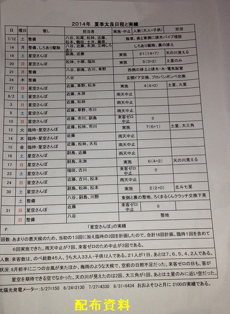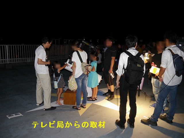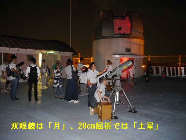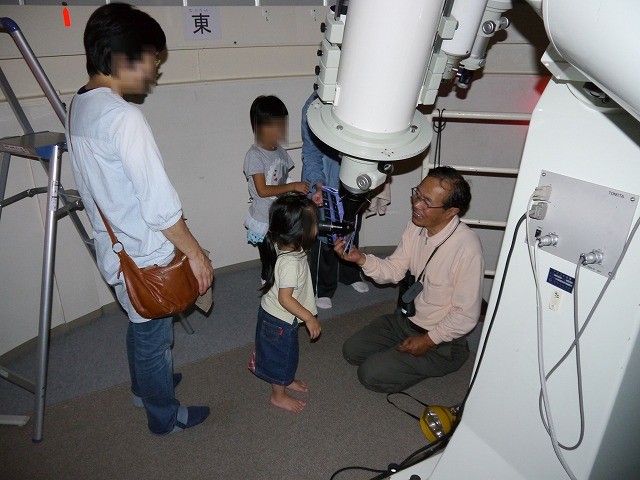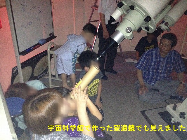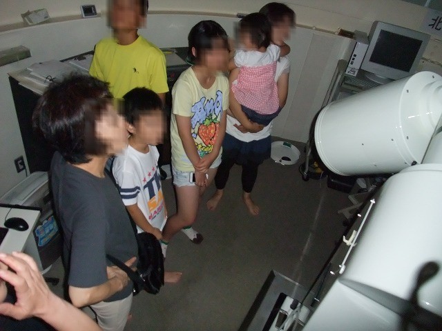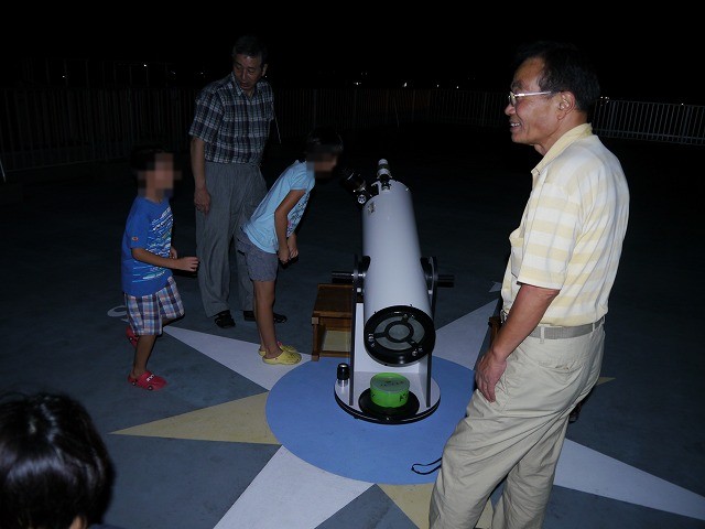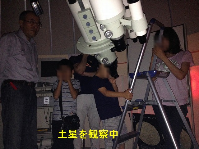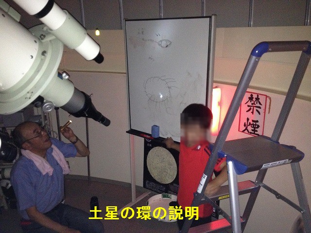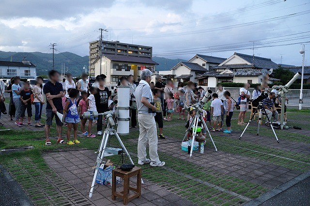 8月23日 西与賀コミュニティーセンター(佐賀市天文台) 夏武雄はドン曇りでしたが、佐賀は西空に晴れ間があり、とにかく開けたら結構お客さんが来ました。 早めに来た宇宙好き少年の一家は、土星、火星、夏の大三角をスケッチし、説明をメモして、「これで夏休みの宿題はバッチリだ」と満足して帰りました。20時15分頃、国際宇宙ステーションが北西から頭上をこえて南東に 向けて通過し、これには親子とも大感激でした。次第に薄雲が全天を覆ってくるなか、来る人に次々と土星を見て もらい、夏の大三角を説明し、宇宙の話などをしました。最後はべた曇りになり、お客さんも居なくなったので、少し 早目に終了しました。 観望対象:土星、火星、夏の大三角、北斗七星と北極星、国際宇宙ステーション 来訪者:17名(うち子供9名) 担当者;永渕、園田、近藤 報告・写真:近藤 写真 1、2、3 、4 |