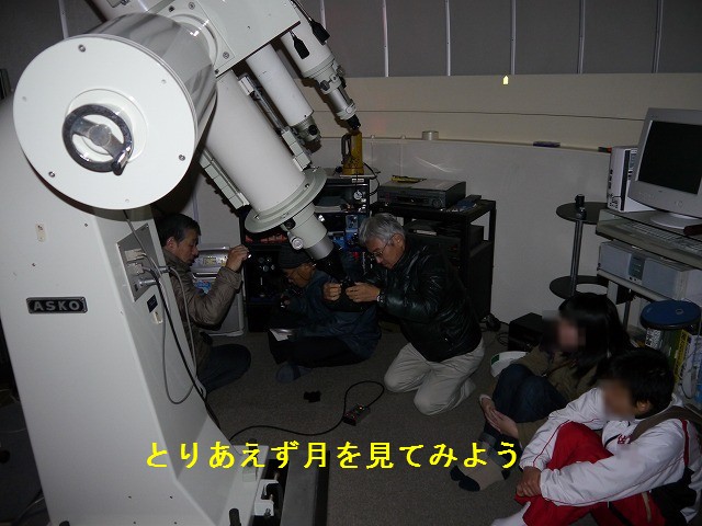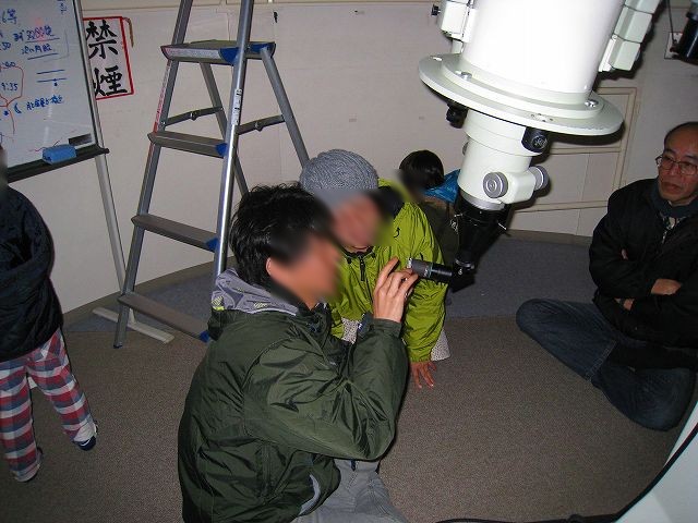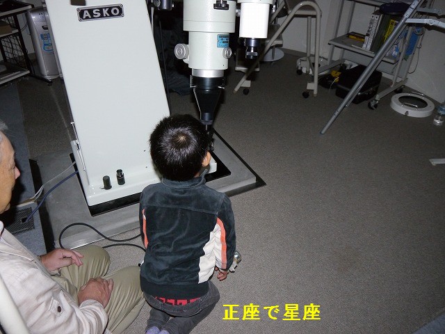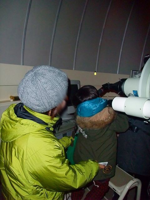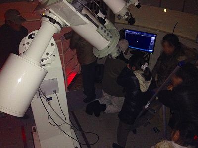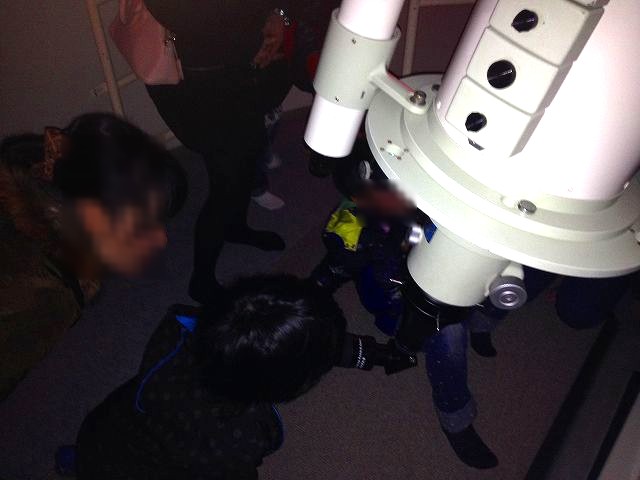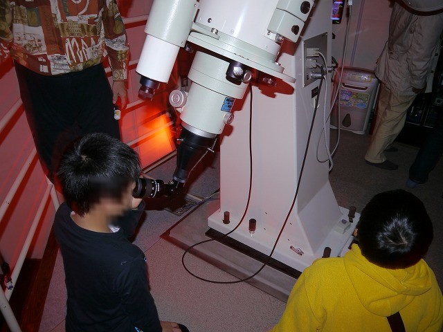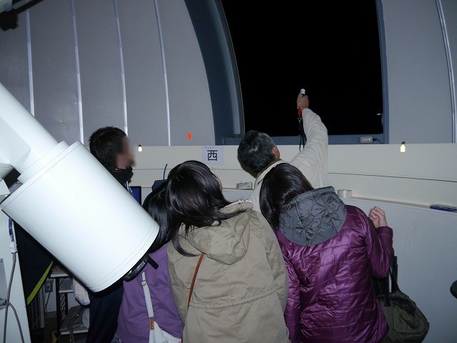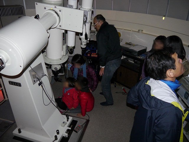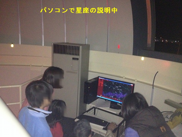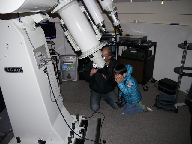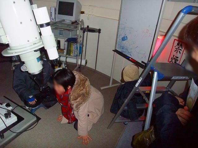 2月22日 西与賀コミュニティーセンター(佐賀市天文台) 観望会開始のころは雲が多く、雲の合間から明るい星が見える程度でした。 定刻前に5人の親子連れが来られましたが、天頂近くに見えていた木星とふたご座のカストルを見てもらいました。透明度は良くなかったのですがシーイングが比較的良くて、木星の細かい模様や大赤斑も確認できました。 雲が多く、ほかに望遠鏡で見えそうな星が無かったので、屋上広場で星座の説明などをしました。 県庁展望ホールでカノープス観察会があっていることもあり、カノープスを捜索しましたが、雲が多くなかなか見つけることができませんでした。雲が少し少なくなってきた頃に、20cm屈折望遠鏡で見つけましたが、やっと見える程度でした。 雲がほとんどなくなってきた頃に、7×50双眼鏡で見つけることができましたが、この時は、来訪者が帰られたあとでした。 観望対象:木星、カストル、、カノープス、すばる 来訪者:11名(内子供6名、小池会員の家族含) 担当者;永渕、松林 報告・写真:松林 写真 1、2、3 |