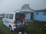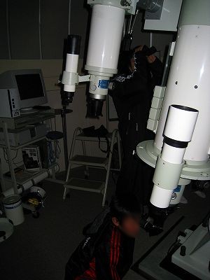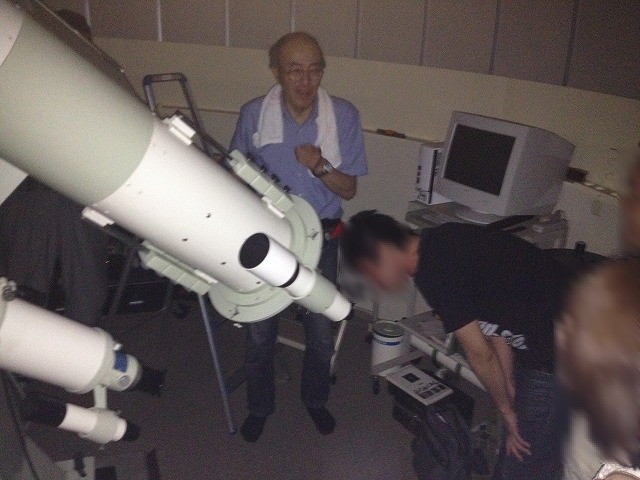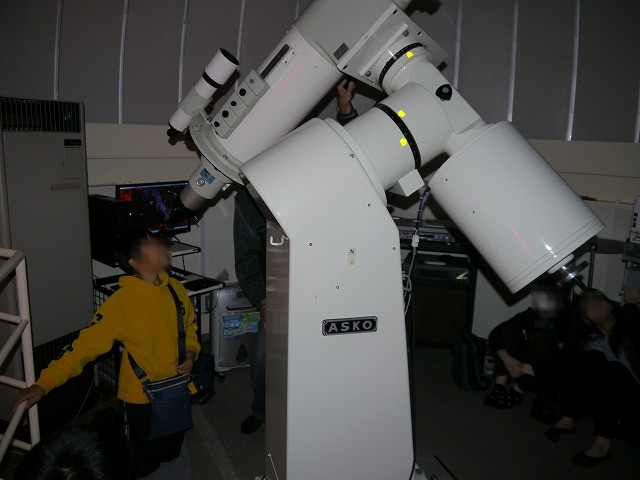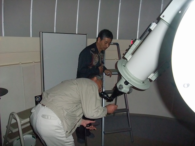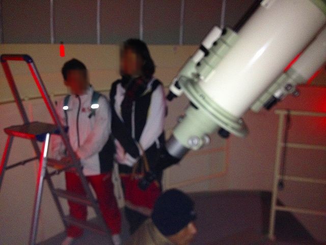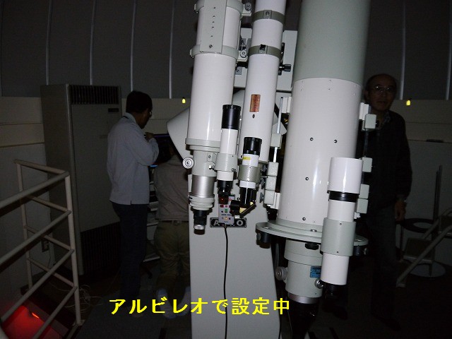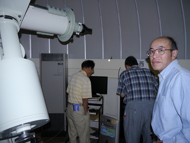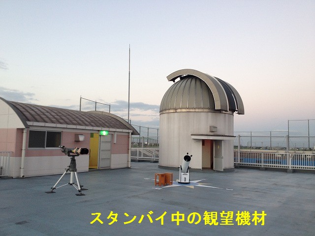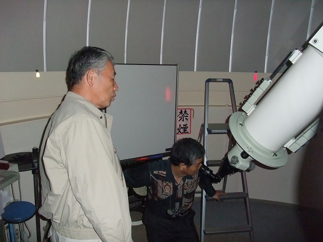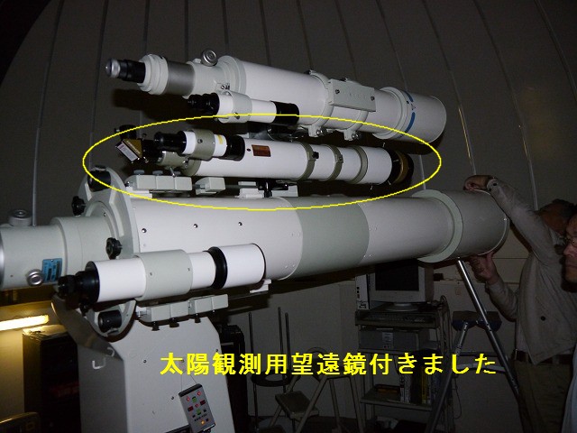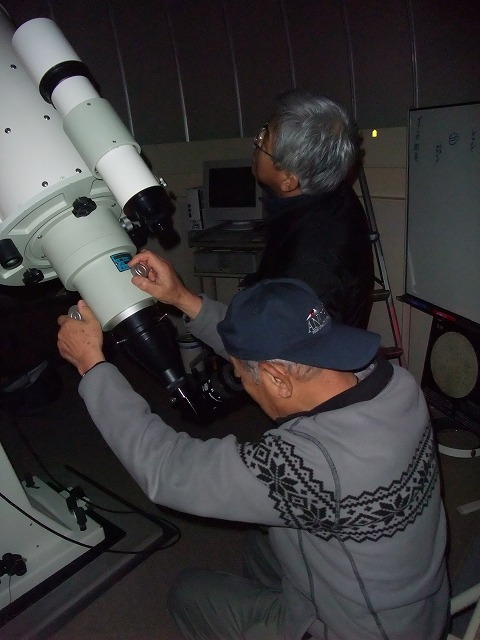 9月20日 西与賀コミュニティーセンター(佐賀市天文台) 雲が多く天頂付近がわずかに見えている程度でした。最初に来られた家族の子供さんは土星を見たかったらしいのですが天気状況と低高度のために条件が悪くあきらめてもらいました。アルビレオ付近を見れる範囲で観望してもらいました。いつもの常連さんのご家族と全部で3家族ほど来られましたが観望対象が少なくドーム内で雑談になりました。涼しいと言うより寒いぐらいでした。お客さんも全員帰られたので、天気の回復も見込めなかったため早めに撤収しました。太陽観測用の望遠鏡が付けられていました。調整が済んでいるのかわかりませんが既設の12.5cm屈折との近接干渉がありこの状態では見にくいようです。終了時に赤道儀上のバランスが会っていないのでFIXしにくい状態です。終了時のドーム内温度は20.3度でした。SQMは欠測です。 観望対象:ベガ、アルビレオ、こと座ε 来訪者:約11名(うち子供約5名) 担当者;内川、松林、/園田、松尾 報告・写真:松尾 写真 1、2、3、4、5、6、7 |