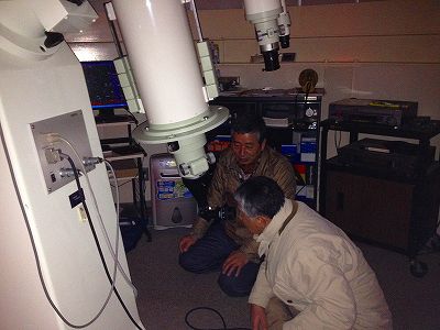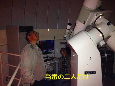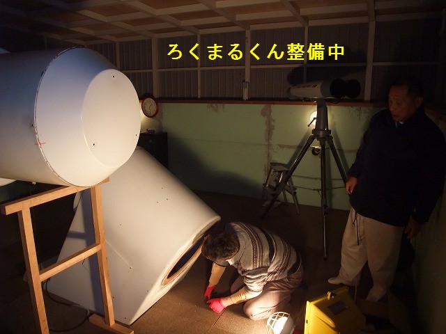 1月25日 西与賀コミュニティーセンター(佐賀市天文台) 日中から雨模様だったので、観望会は中止だろうと担当者も思われていたようですが、なんと19時頃には木星が見えてきました。19時過ぎに報告者が着いたときには当番の近藤会長と永渕副会長が20cm屈折をセットアップ中でした。低層の動きの速い雲に時々さえぎらる中で天王星から観望を開始しました。来訪者もなかったのでしばらくあちこちの二重星を見ていまた。相変わらず雲が多かったので木星の観望をしました。その木星もモヤがかかった見え方でした。その後も来訪者は無く、どうしようかと話していたら、頬で感じるくらいの小雨が降ってきたのでドームのスリットを閉めました。雲もかなり広がってきたので中止を決定しました。20:50終了。この時期には比較的あたたかくドーム内は12.8℃でした。 観望対象:天王星、さんかく座ι、アンドロメダγ、カストル、木星 来訪者:0名 担当者;近藤、永渕/松尾 報告・写真:松尾 写真 1、2、3 |