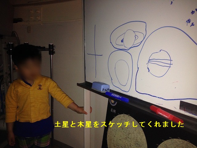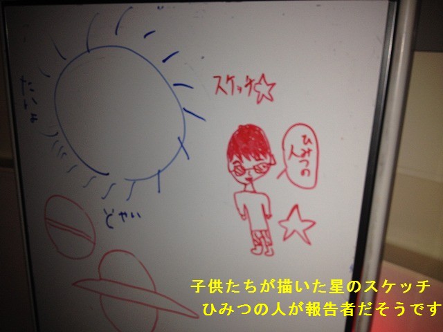 5月3日 西与賀コミュニティーセンター(佐賀市天文台) 昼から天気が良くて連休で来訪者も多いのではと予想していましたが、普通でした。長期旅行か昼間の行楽疲れで夜の外出が難しかったのかもしれません。20時の観望会開始時間には天文協会員だけでしたが、しばらくすると家族連れが来られて賑やかになりました。西の空の月を始め木星、火星、土星と一通り見てもらいました。後から来られた家族にも再度同じような感じで見てもらいました。後は、カストルやしし座γなどの2重星や星団を見ました。透明度は良かったのですがシーイングが良くありませんでした。意外と気温が下がりこの時期には寒い観望会でした。子供たちがホワイトボードに今日見た星のスケッチを描いてくれました。 観望対象:月、木星、火星、土星、カストル、しし座γ、M44,M104 来訪者:12名 担当者;鶴田、小柳/近藤、園田、松尾 報告・写真:松尾 写真 1、2、3 、4 、5 |