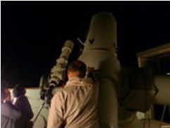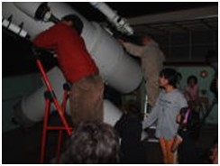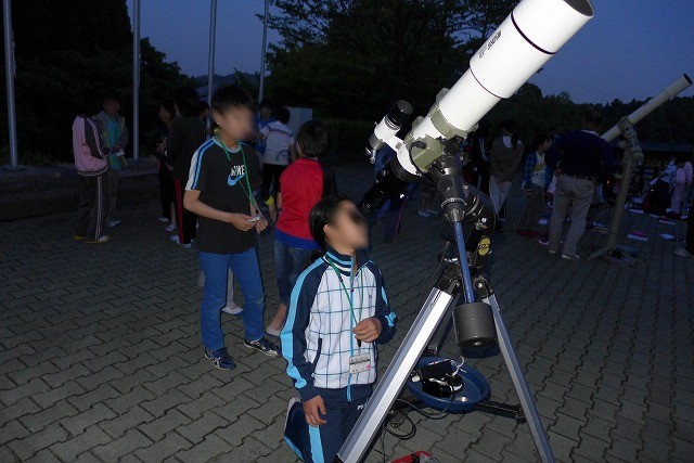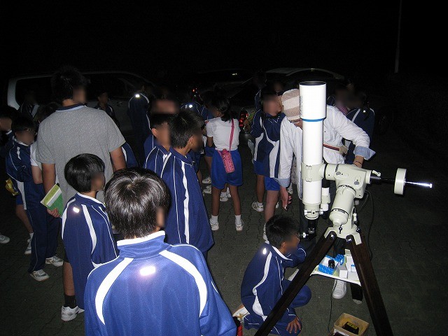 5月13日 御井小学校5年生様 北山少年自然の家 レクチャーなしで19:30に全員広場に集合して薄明時の空で一番星を見つけようと呼びかける。 薄雲がかかっていたが、子供たちは次々と西の空の木星を見つけた。 ニコン10cmとボーグ12.5cmの2台の屈折鏡で、木星とガリレオ衛星を見てもらう。 次に月齢14の月、さらに火星を観察する。 月明かりともやの中でも2等星ぐらいまでは見えていたので、星座探しと星座の話をする。 終わりごろには、土星も昇ってきたので最後に観望してもらって天体観測会を終了する。 19時30分~21時 55名 担当:鶴田、副島 報告・写真:鶴田 写真 1、2、3、4、5 |