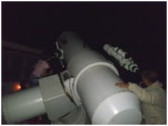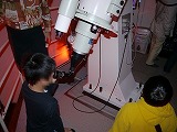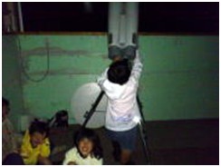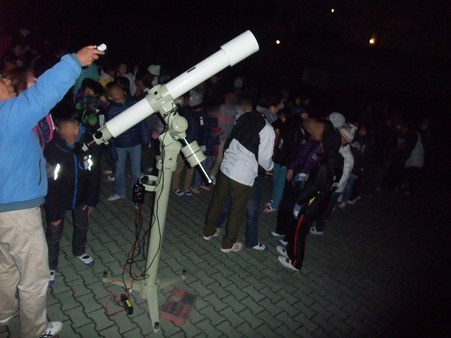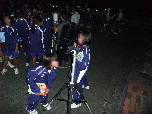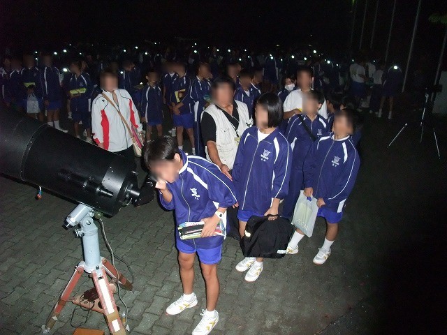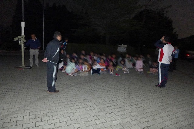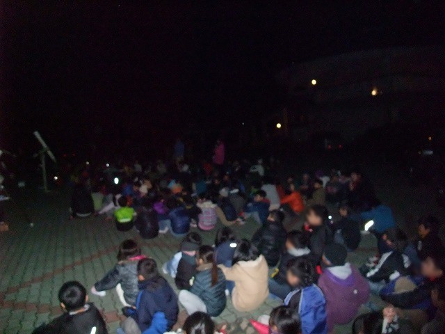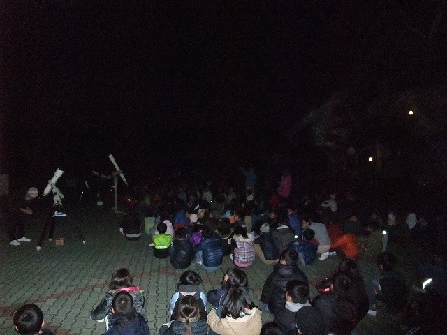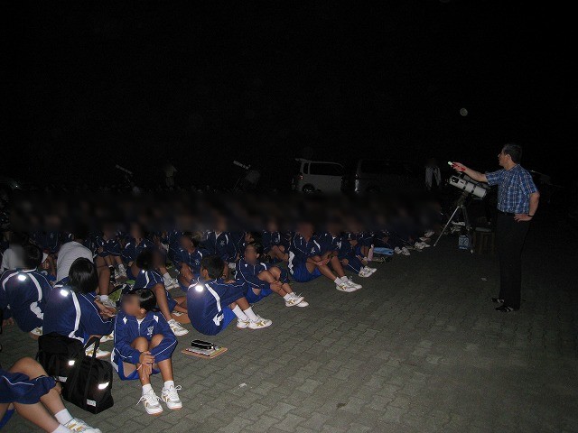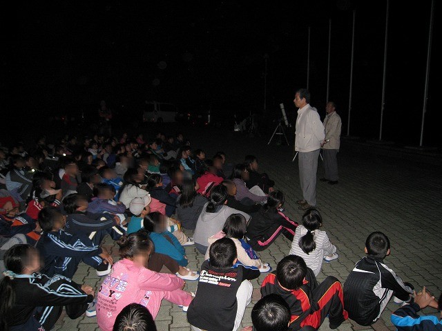 10月15日 東若久小学校様、南当仁小学校様 (北山少年自然の家) 東若久小学校と南当仁小学校の合同での観望会だったので、それぞれの学校ごとにオリエンテーションホールでの星の話と外での星の観望とを交替で行いました。オリエンテーションホールでは、副島さんが、ステラナビゲータを使った今日の星空や皆既月食の話をしました。外では、まず近藤会長が、星座や北極星の見つけ方などを説明し、その後、望遠鏡でアルビレオ、M22、アンドロメダ座大銀河、すばるなどを観察しました。また、双眼鏡で アンドロメダ座大銀河や天の川付近の星を観察しました。久しぶりに天の川がはっきり見える好天で、東若久小学校の先生が、3年目にして初めてすっきり晴れた空での観望ができたと喜んでおられました。 参加者:東若久小学校 67名、南当仁小学校 119名 観望対象:アルビレオ、M22、アンドロメダ座大銀河(M31)、すばる(M45)、天の川 担当:近藤、副島、永渕、大石、松林 写真 H1、H2、H3、M1、M2、M3 |