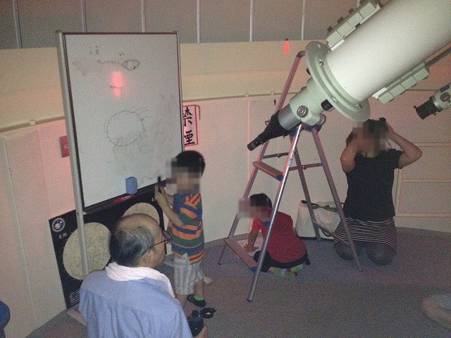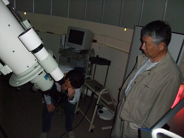 8月30日 太良旅館組合様「星空さんぽ」(太良観測所) お客さんが来られた時には全天曇りで星は全く見えなかったのですが、副島さんがレーザーポインターを使って星座の説明をし、その内容があたかもそこに星が見えているようだと感激されていました。 そのあと、スライディングルーフ内で望遠鏡や双眼鏡の説明をしたり、ステナビを使って星座の説明などをしました。終わりごろに北斗七星の一部が見えたので、双眼鏡で観望してもらいました。星がきれいに見えるときにぜひまた来たいと言っておられました。 観望対象:北斗七星 お客様:大人2名、子供0名 旅館スタッフ: 担当者:副島、松本、松林 報告・写真:松林 写真 1、2 |