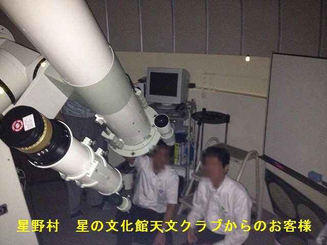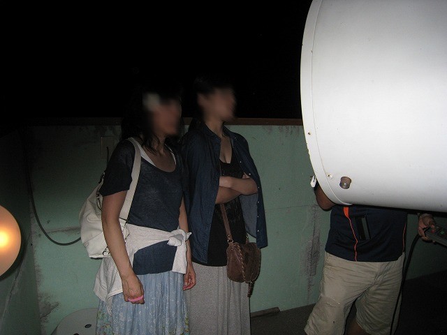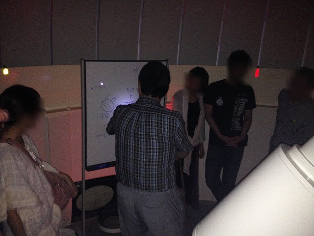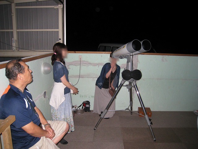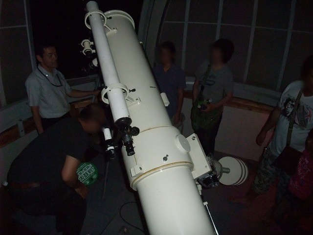 7月27日 太良旅館組合様「星空さんぽ」(太良観測所) 快晴の空が20じ過ぎから一転して、星ひとつも見えない空になった頃お客さんが到着しました。 空の様子見の間、スライディングルーフ内のろくまるくんと、ドーム内の26センチ望遠鏡の見学をしました。 雲の切れ間から火星が見えたので、草野さんがドブソで案内し、次いで土星を何とか見てもらいました。さそり座の半分が見えアンタレスの説明をした後は晴れ間があらわれず、福岡の古賀と宇美から来た二組の夫婦は、天の川を見たことが無いそうで、残念そうでした。曇り空にレーザー光線で夏の星座の説明をし、伝統的七夕の日や七夕祭りの歴史と五節句の話や天の川の正体等の話を楽しんでもらいました。 いろいろ対話をするうちに予定の時間が来て、「土星だけでも見てよかった」と言われて帰られました。 観望対象:火星、土星、さそり座 お客様:大人4名、子供0名 旅館スタッフ:3名 担当者:草野、近藤、松本 報告・写真:近藤 写真 1 、2 |