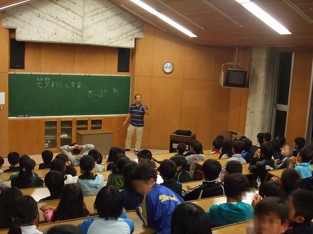6月10日 長丘小学校5年生様 北山少年自然の家 雨の降りそうな空だったので、視聴覚室で映像と話で実施しました。 最初副島さんが今日の星空案内を、ステラナビで行いました。春の星座と惑星と月を紹介しました。木星、火星、土星、月の拡大映像には歓声が上がりました。土星を見せてあげられなかったことは私たちも残念でした。 ついで近藤が「七夕祭りと宇宙」の話をしました。梅雨の真っただ中になってしまっている今日の七夕の難点を解決するものとして、国立天文台が「伝統的七夕の日」とライトダウンを呼び掛けていることを紹介しました。そして1300年前に中国から伝わり、5節句の一つとして広く行われてきた歴史、七夕を「たなばた」という理由、、さらに七夕の星と天の川についての天文学的話などをしました。最後は写真獲得じゃんけん大会で盛り上がって終わりました。 19時30分~21時 5年生112名、先生5名 担当:近藤、副島 報告・写真:近藤 写真 1、2、3、4 |