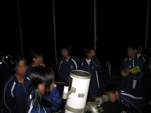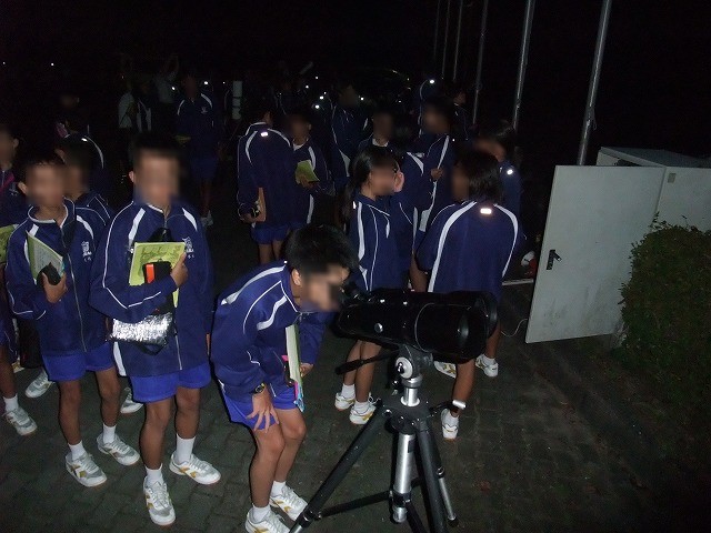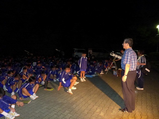 9月9日 平尾中学校様 北山少年自然の家 大人数のため二班に分けて、屋内の映像・話と屋外の観望を交互にしました。ただ土星が西空低いので、まず全体で土星を観察した後に二班に別れました。オリエンテーションホールでは副島さんが、ステラナビによる今日の星空の案内、お月見とスーパームーンの話、10月8日の皆既月食の紹介などをしました。屋外では近藤が夏の大三角、さそり座、北極星の見つけ方などを案内した後に、6台の望遠鏡・双眼鏡に分散して土星、月、アルビレオ、はくちょうざγ付近の天の川などを観察しました。ときどき雲が流れて来ましたが概ね晴天で、1等級の人工衛星や流星も現れ、満月が明るい中で目的は達成しました。平日の忙しい中6名もの会員が協力してくれたので、270名の生徒をかかえた先生からは大変感謝されました。 参加者 生徒270名、先生15名 観望対象:土星、月、アルビレオ、天の川の星野 担当:近藤、副島、松林、永渕、鶴田、市川 報告:近藤 写真:副島、近藤、松林 写真 1、2、3、4、5、6、7、8、9、10、11、12 |