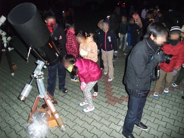 11月19日 姪浜小学校様 (北山少年自然の家) 気温5度、薄雲に悩まされながらも夏から秋の星空を観察しました。 初めは室内で、副島さんがステラナビを使用して、今日の星空と主な天体を映像で見ました。西空に夏の大三角、上にはエチオピア王家をめぐる秋の星座、東天におうし座を確認し、アルビレオの二つ星の色の観察を宿題にして、外に出ました。 レーザー光線による星空案内の後、6台の望遠鏡、双眼鏡の前に生徒さんたちは並んで、アルビレオ、M31、h・X,すばるなどを観察しました。大型双眼鏡で見るすばるの星々の輝きには、驚きの声が上がりました。 室内に戻ってから、宿題のアルビレオの色を問うたところ、オレンジと青だけでなく6~7種類の異なる色合いが出されました。最後の質問タイムでは「星の色はなぜ違うのか?」等に応えて終了しました。151人に対応するために、多くの皆さんに協力をいただきました。 参加者:5年生・143人、先生・8人 観望対象:夏の大三角、秋の星座、アルビレオ、M31、h・X,すばるその他 担当者:副島、大石、市川、太田、近藤 報告・写真:近藤 写真 1、2、3、4、5、6、7 |