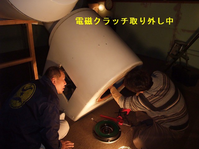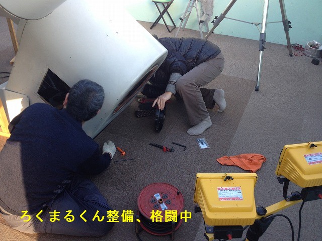 11月30日 太良観測所整備 雨模様のため、予定していた除草作業を延期して、「ろくまるくん」修理作業を行いました。K-ASTEC川野氏に依頼して修理がおこなわれました。不具合のある電磁クラッチを取り外す作業が行われました。順調に作業が進み午前中で終わりました。少し遅めの昼食を済ませて14時過ぎには終わりました。チョットだけ古川会員が刈払機で除草作業をしましたが雨の中、続行は難しく撤収しました。終日、雨だったが玄関ドア内側への雨水侵入状況、芝生内コンクリート舗装平面周辺の水はけ状況などが確認できました。 参加者;近藤、副島、古川、松尾 整備:K-Astec さん 報告:松尾 写真:近藤、松尾 写真 1、2、3、4、5、6、7、8、9、10、11、12、13、14、15 |