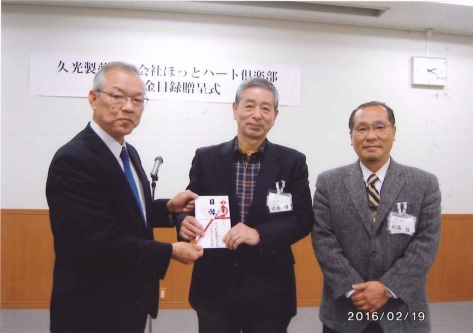 2月19日(金) 久光製薬寄付金目録贈呈式 久光製薬(株)の社会貢献活動を進めている久光製薬株式会社ほっとハート倶楽部より、寄付の対象としてお話を伺いたいというお話があり、昨年11月10日に担当者にお会いして、天文協会の活動についてお話をし、資料をさしあげました。 1月に決定通知があり、2月19日の贈呈式に会長・近藤と事務局長・副島の2名が参加しました。 鳥栖の本社には、対象となった全国55団体の内、九州地区の22団体が集まりました。各団体が寄付金目録の贈呈を受けた後に、挨拶と活動紹介をしました。障害者支援、子育て支援、絵本の読み聞かせ、離島の振興、国際協力など多彩な分野のNPOなどの活動が紹介されました。天文協会も近藤会長が、長年の天文普及活動を報告し、4月にオープンする佐賀市星空学習館の開館記念行事への寄付金の活用と渡部氏の講演への参加呼びかけをしました。その後の質疑応答では、副島事務局長が、貼り薬の薬効の仕組みや貼ることの工夫についての科学講座をお願いしました。最後は工場見学で、サロンパスの製造・梱包ラインの説明を受けて終わりました。 出席者:近藤、副島 写真 1、2 |