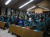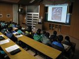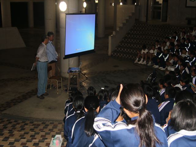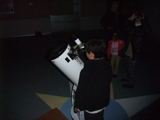 | 4月10日 成頴中学校(北山少年自然の家) 19:40~21:15 全天、曇っていましたが、月齢3の月や木星はなんとか見えていたので、20時の開始時間を少し早めて、山に隠れる前の月を観望してもらいました。 そのあと、視聴覚室で近藤会長から、人も宇宙人であることなどの話やステナビによる星座の解説をしました。引き続き天体写真獲得のじゃんけん大会を 行ったあと再び外に出てもらい、木星の観望をしました。雲を通しての観望だったので良くは見えなかったけど、木星のしま模様などに感動している生徒もいました。 質問の時間では、だれも質問する人がいなかったので、会長がUFOの話をして観望会を終わりました。 観望対象:月、木星 参加者:1年生74名、先生5名 担当者:近藤、松林 写真 1 |