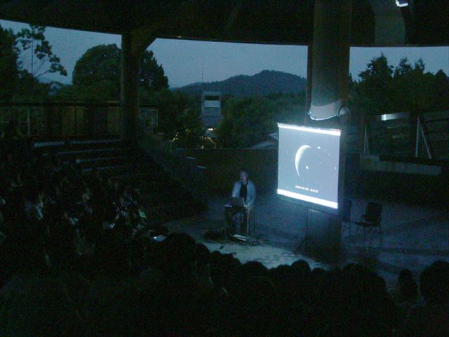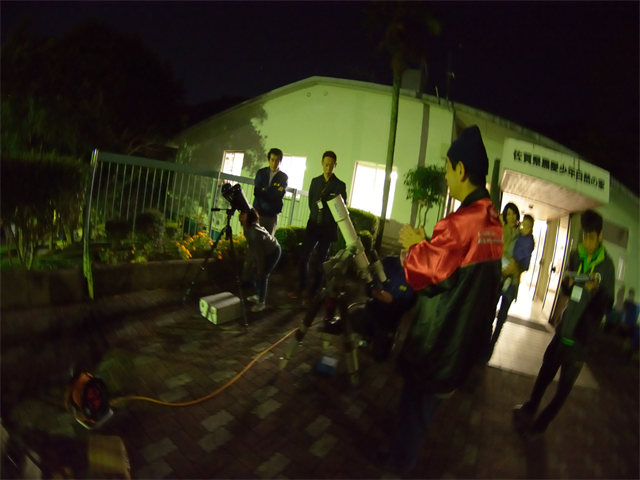 | 6月21日 福岡市立野間中学校(北山少年自然の家) 19:30~21:00 初めに、古川さんが今夜の星空についての話をステラナビゲーターを用いて行いました。中学校の学習に沿ったような分かりやすい説明で、生徒さんも真剣に聞いている様子でした。自分の誕生12星座について話を振った時は、生徒さんの反応が多くありました。その後、山口守さんが三鷹のシュミレーションソフトを使った宇宙旅行といった趣での話を行ったところ、大盛り上がりで歓声が上がっていました。そうこうしているうちに、天上に輝く木星がちらほらと見え、東の空の火星も雲間から見え隠れをしながら見えるようになってきました。そこで、屋外の体験学習を開始。雲に阻まれながらも、火星と木星はなんとかみてもらうことができたようです。 観望対象:木星、火星 参加者:165人 担当者:近藤、副島、大石、古川、山口マ・メ、大田、 報告:大田 写真 1、2、3、4、5 |