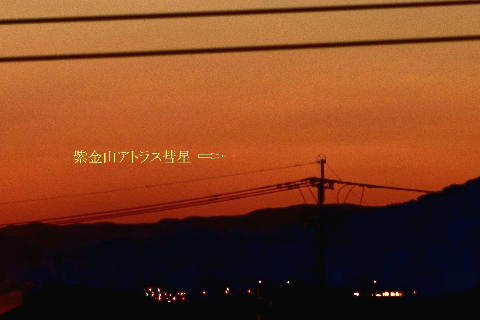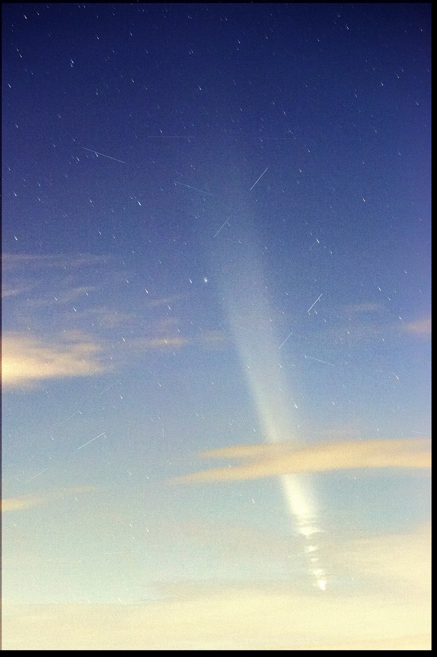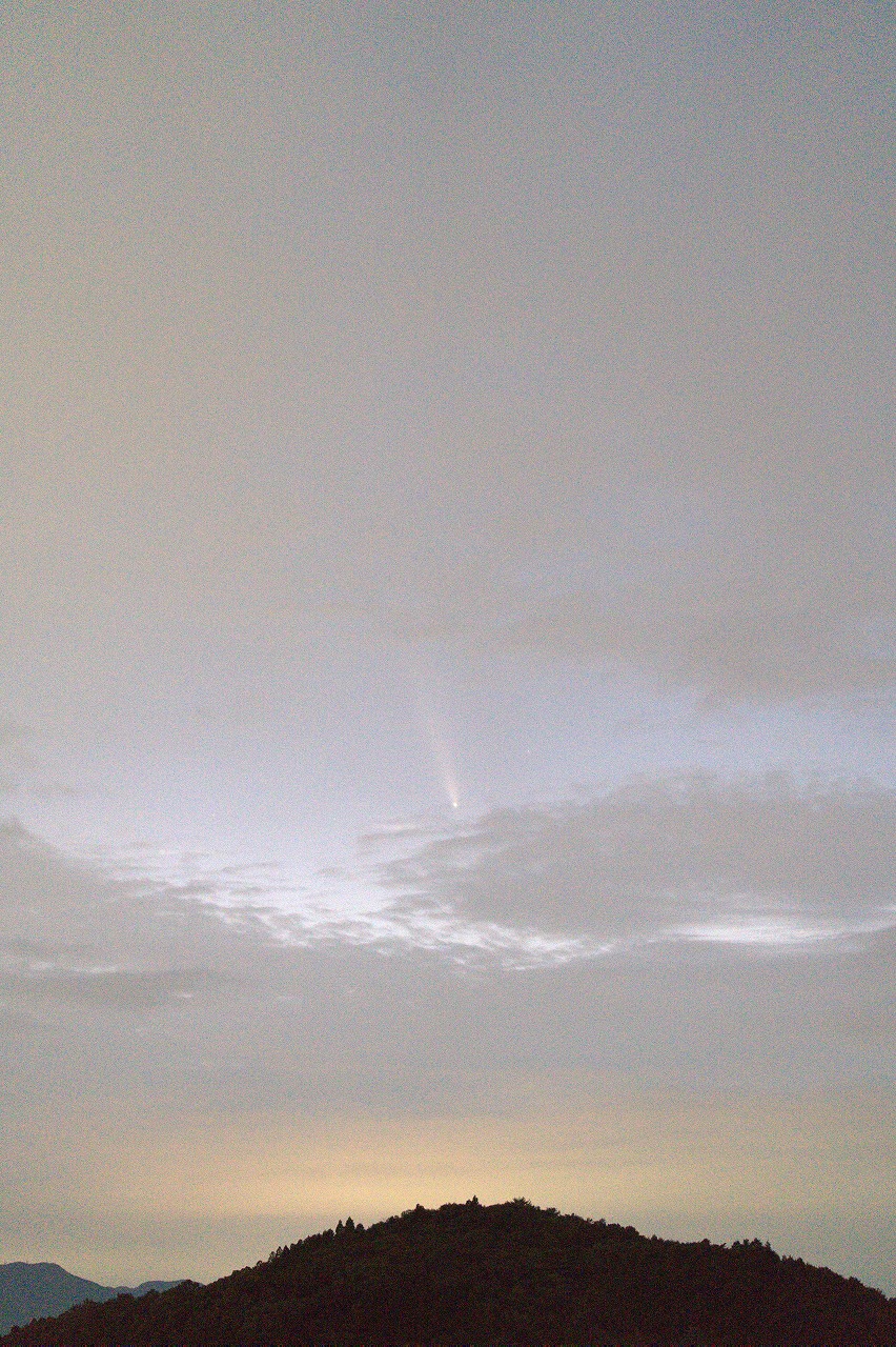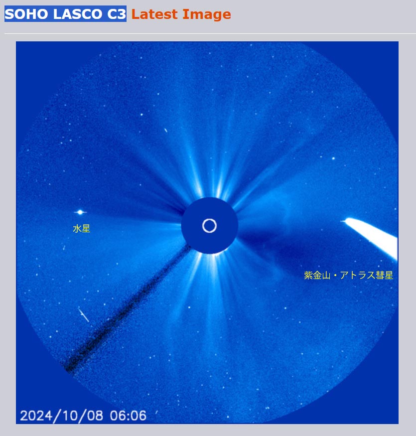 10/10 SOFO画像![]() 10/12 野田尚之氏撮影 ![]() 10/14 小柳祥康氏撮影 ![]() 10/30 古川隆徳氏撮影 ![]() | 10月中旬 紫金山アトラス彗星報告 ~ 10月12日に近日点を迎え、どうにか消滅をせずに地球に近づいてきた紫金山アトラス彗星。 太陽に近いために、12日頃の地球最接近を待つことになった。10月8日にSOHO LASCOの画像で姿を確認! さらに、10月9日COBS報告の彗星光度が-3等級に。翌日には-5等級に。 11日に星空学習館で初めて観測に成功し、その後夕空では10月末頃まで観測することができた。 スマホで撮影できるほどの明るさになり、多くのメディアに取り上げられ、天文ファンのみならず、 大衆から注目される彗星となった。天文協会の会員も各自で観測・撮影を行い、メーリングリスト上で 情報を交換した。 <以下、ML報告> 10/8 A3が SOHO LASCO に現れてきました。一寸、期待持てるかな?(副島)SOHO画像:1 10/09 10/8現在の明るさは、-3等級ほど! これは当初の予想よりも4~5等も明るいです。(COBS報告/早水) 10/10 もっと凄いことになっています。現在 -5等ですって!(COBS報告/早水)SOHO画像:1 10/10 雲がどいてくれなく撮影はできませんでした。イオンテールだけでも写らないかなと思ったのですが無理でした。(野田) 10/11 18時20分で当地では日没後約30分、地平高度約3度で星空学習館の20cmで確認。7×50双眼鏡では見えず。(早水) 10/11 写真の中に彗星をらしい物が写ってました。(古川)写真:1 10/12 日没後かなり暗くなって、なんとか双眼鏡で確認してからの短時間の撮影でした。(宮原)写真:1 10/12 日没30分後の16h20m頃に 7x50双眼鏡で発見。その後は、双眼鏡では余裕でいた。上方に延びる尾も肉眼で見えた。(早水)写真:1 10/12 街の風景が入った写真は凄く絵になりました。(古川)写真:1 10/12 遠征3日目にしてやっとA3彗星捉えることができました。(野田)写真:1 10/13 昨夜の彗星は、事前に想像しているよりとても素晴らしかったです。私はスケッチを取りました。(早水) 10/14 13日18時00∼40分双眼鏡で尾までよく見えました。久しぶりの「らしい」彗星です。肉眼では、何とか存在がわかりました。(高瀬) 10/13 嘉瀬川近くの田んぼの中で見ましたが、肉眼でも何とか確認できました。写真:1 10/14 小城八丁ダムで雲が多く完全な姿は見れませんでしたが、かろうじて観察できました。(小柳)写真:1 10/14 尾っぽは眼視で見た感じでは前日の3倍ぐらい長くなってました。(古川)写真:1,2 10/15 スマホで撮りましたがしっかり写っていました。肉眼でも微かに核が見えていました。(上野)写真:1 10/15 前日に比べかなり尾が長く見えていたと感じました。(宮原)1 10/16 樫野撮影写真:1 10/18 約3等級。尾は薄くなっているが肉眼で確認。10°以上、15°以下。12°前後でしょう。(早水) 10/18 サクッとスマホで撮ってみたら案外写ってました。(野田)写真:1 10/19 星空学習館の観望会実施。晴れ間から観察できた。肉眼でやっと分かるくらい4等級くらい。(早水)写真:1 10/20 富士山新五合目まで遠征して撮影しました。(樫野)写真:1 10/21 明るさは十分暗い所だとまだまだハッキリと見れます。(古川)写真:1 10/21 20時ころまではとても透明度の良い空で、彗星も天の川も見えていました。(近藤) 10/30 肉眼では分かりづらいレベル。双眼鏡ではまだ尾がしっかりみえてました。(古川)写真:1 11/03 10㎝双眼鏡では小さく光る核と尾がしっかり見えました。すぐ近くの5.5~5.7等星よりは暗いようでした。(近藤) |