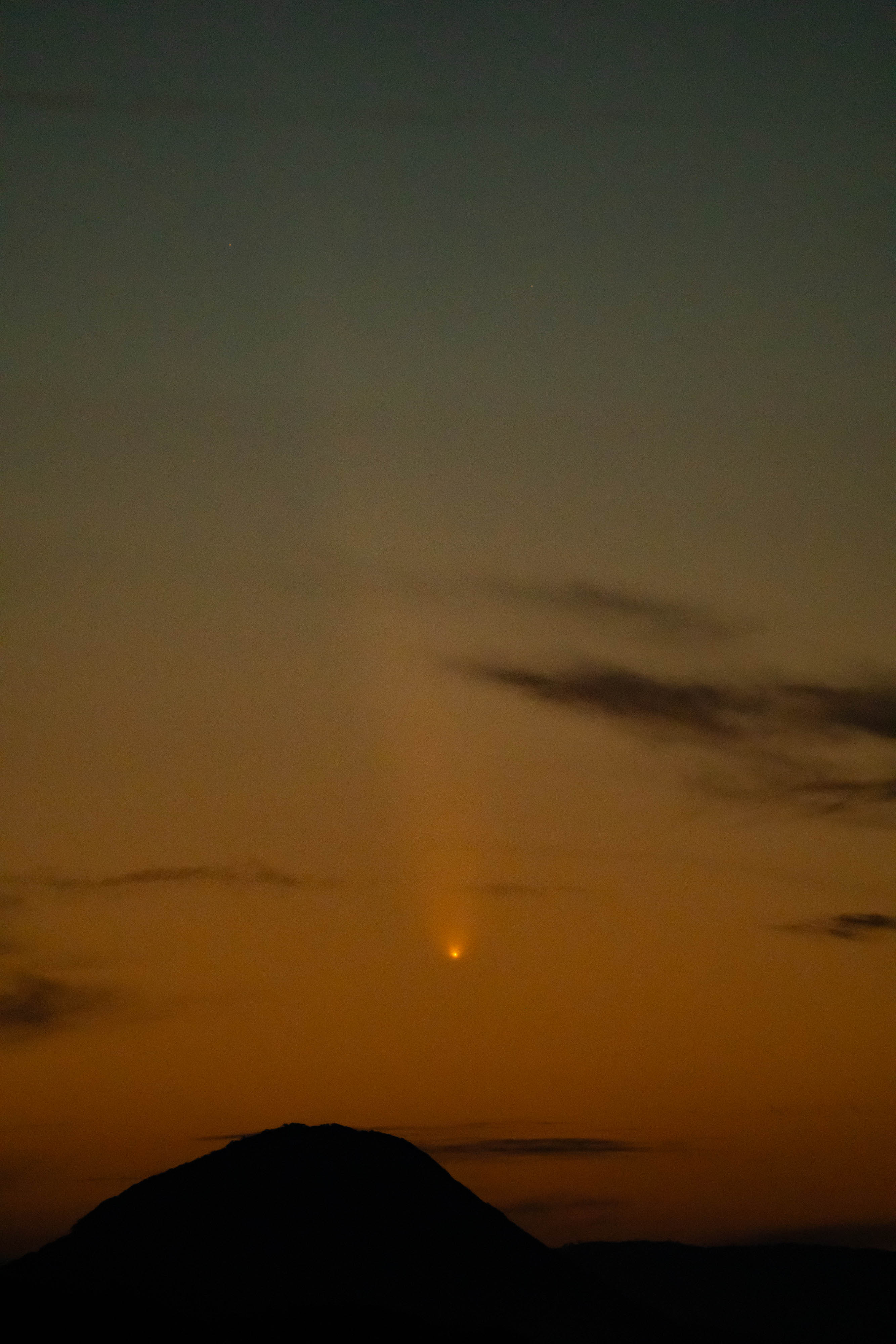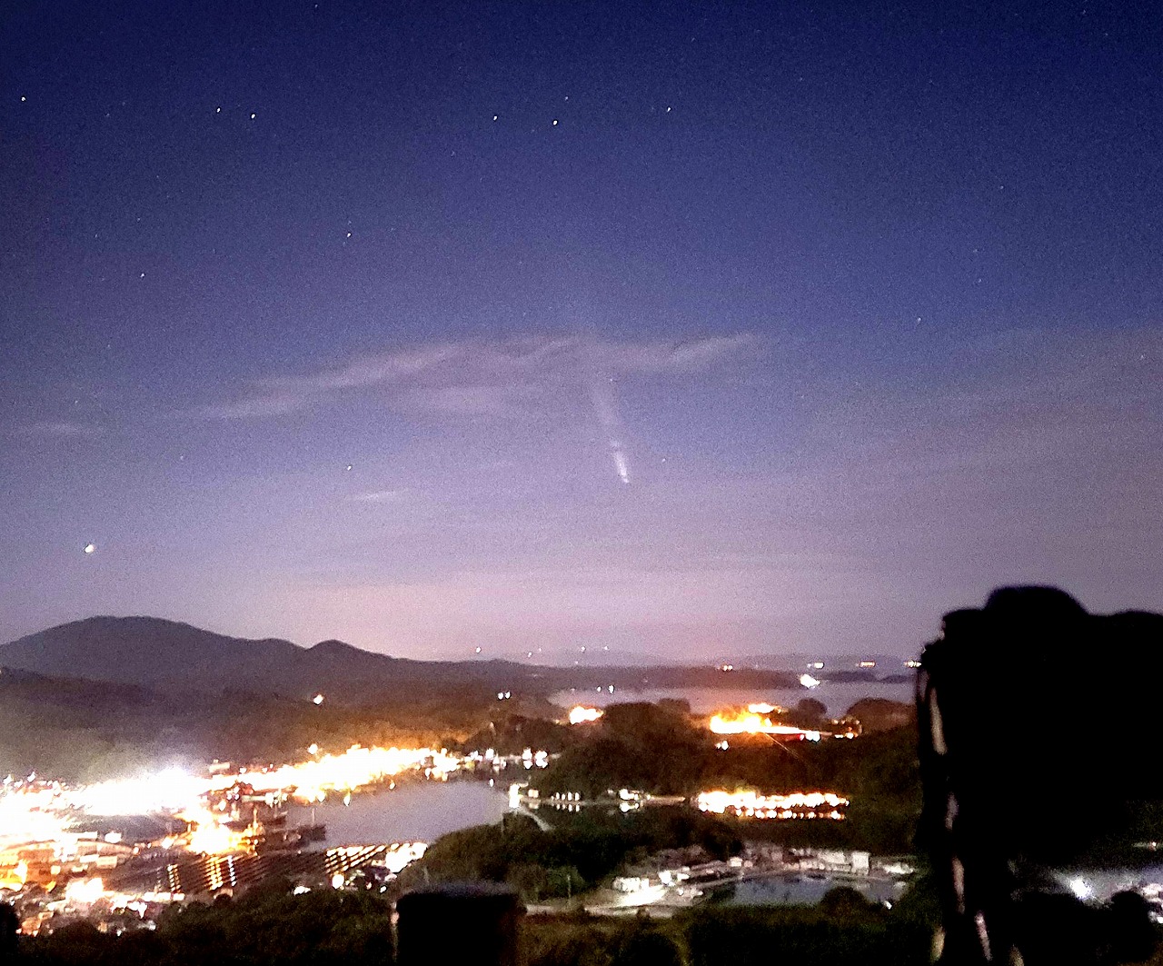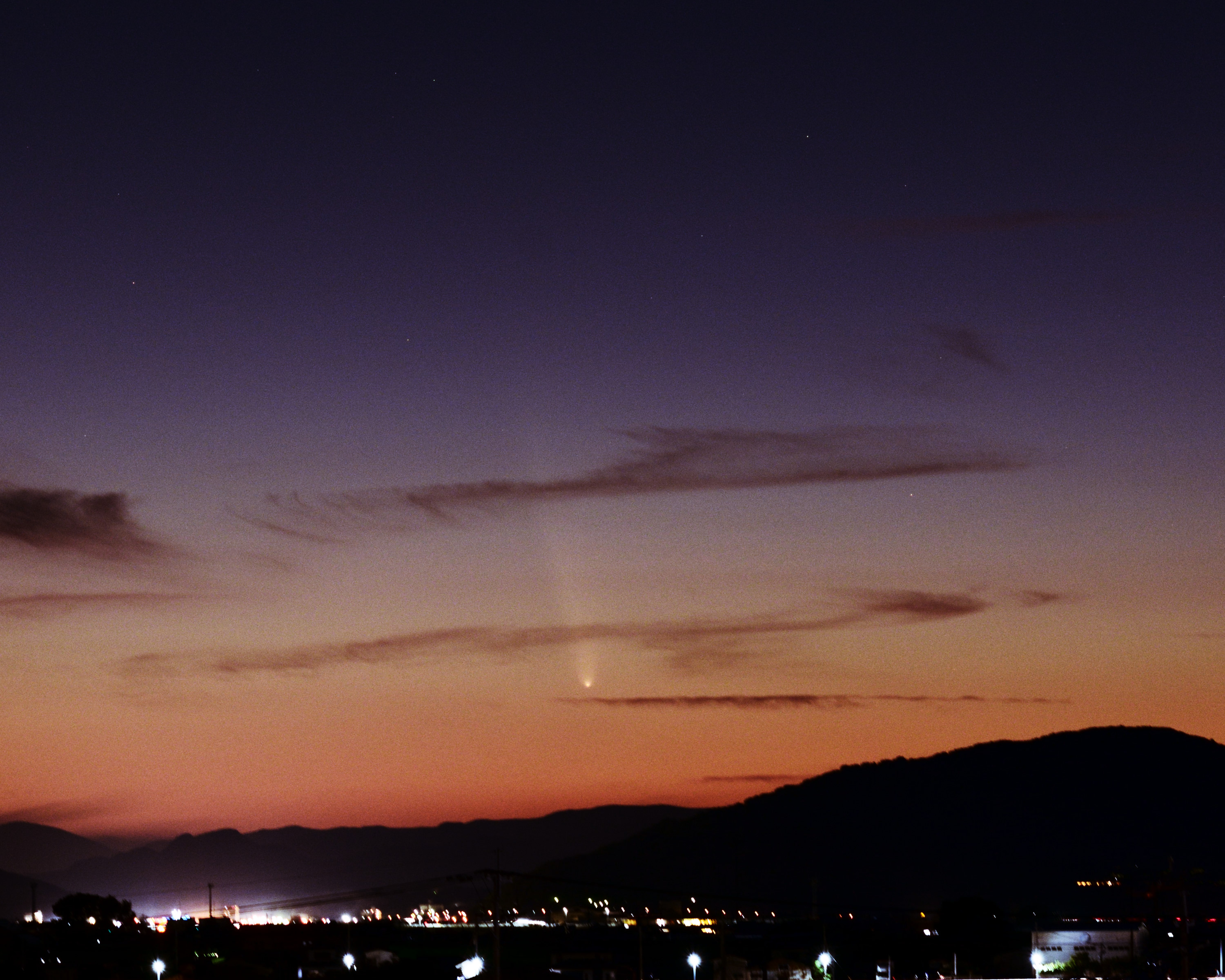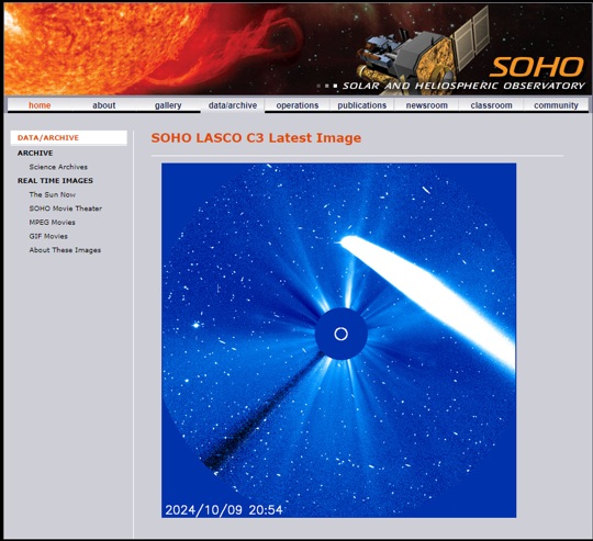 10/10 SOFO画像![]() 10/12 野田尚之氏撮影 ![]() 10/14 小柳祥康氏撮影 ![]() 10/30 古川隆徳氏撮影 ![]() | 10月中旬 紫金山アトラス彗星報告 ~ 10月12日に近日点を迎え、どうにか消滅をせずに地球に近づいてきた紫金山アトラス彗星。 太陽に近いために、12日頃の地球最接近を待つことになった。10月8日にSOHO LASCOの画像で姿を確認! さらに、10月9日COBS報告の彗星光度が-3等級に。翌日には-5等級に。 11日に星空学習館で初めて観測に成功し、その後夕空では10月末頃まで観測することができた。 スマホで撮影できるほどの明るさになり、多くのメディアに取り上げられ、天文ファンのみならず、 大衆から注目される彗星となった。天文協会の会員も各自で観測・撮影を行い、メーリングリスト上で 情報を交換した。 <以下、ML報告> 10/8 A3が SOHO LASCO に現れてきました。一寸、期待持てるかな?(副島)SOHO画像:1 10/09 10/8現在の明るさは、-3等級ほど! これは当初の予想よりも4~5等も明るいです。(COBS報告/早水) 10/10 もっと凄いことになっています。現在 -5等ですって!(COBS報告/早水)SOHO画像:1 10/10 雲がどいてくれなく撮影はできませんでした。イオンテールだけでも写らないかなと思ったのですが無理でした。(野田) 10/11 18時20分で当地では日没後約30分、地平高度約3度で星空学習館の20cmで確認。7×50双眼鏡では見えず。(早水) 10/11 写真の中に彗星をらしい物が写ってました。(古川)写真:1 10/12 日没後かなり暗くなって、なんとか双眼鏡で確認してからの短時間の撮影でした。(宮原)写真:1 10/12 日没30分後の16h20m頃に 7x50双眼鏡で発見。その後は、双眼鏡では余裕でいた。上方に延びる尾も肉眼で見えた。(早水)写真:1 10/12 街の風景が入った写真は凄く絵になりました。(古川)写真:1 10/12 遠征3日目にしてやっとA3彗星捉えることができました。(野田)写真:1 10/13 昨夜の彗星は、事前に想像しているよりとても素晴らしかったです。私はスケッチを取りました。(早水) 10/14 13日18時00∼40分双眼鏡で尾までよく見えました。久しぶりの「らしい」彗星です。肉眼では、何とか存在がわかりました。(高瀬) 10/13 嘉瀬川近くの田んぼの中で見ましたが、肉眼でも何とか確認できました。写真:1 10/14 小城八丁ダムで雲が多く完全な姿は見れませんでしたが、かろうじて観察できました。(小柳)写真:1 10/14 尾っぽは眼視で見た感じでは前日の3倍ぐらい長くなってました。(古川)写真:1,2 10/15 スマホで撮りましたがしっかり写っていました。肉眼でも微かに核が見えていました。(上野)写真:1 10/15 前日に比べかなり尾が長く見えていたと感じました。(宮原)1 10/16 樫野撮影写真:1 10/18 約3等級。尾は薄くなっているが肉眼で確認。10°以上、15°以下。12°前後でしょう。(早水) 10/18 サクッとスマホで撮ってみたら案外写ってました。(野田)写真:1 10/19 星空学習館の観望会実施。晴れ間から観察できた。肉眼でやっと分かるくらい4等級くらい。(早水)写真:1 10/20 富士山新五合目まで遠征して撮影しました。(樫野)写真:1 10/21 明るさは十分暗い所だとまだまだハッキリと見れます。(古川)写真:1 10/21 20時ころまではとても透明度の良い空で、彗星も天の川も見えていました。(近藤) 10/30 肉眼では分かりづらいレベル。双眼鏡ではまだ尾がしっかりみえてました。(古川)写真:1 11/03 10㎝双眼鏡では小さく光る核と尾がしっかり見えました。すぐ近くの5.5~5.7等星よりは暗いようでした。(近藤) |