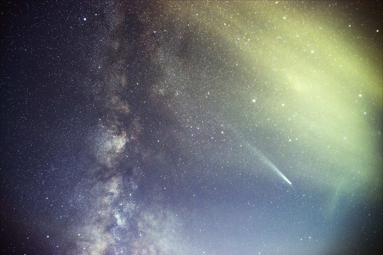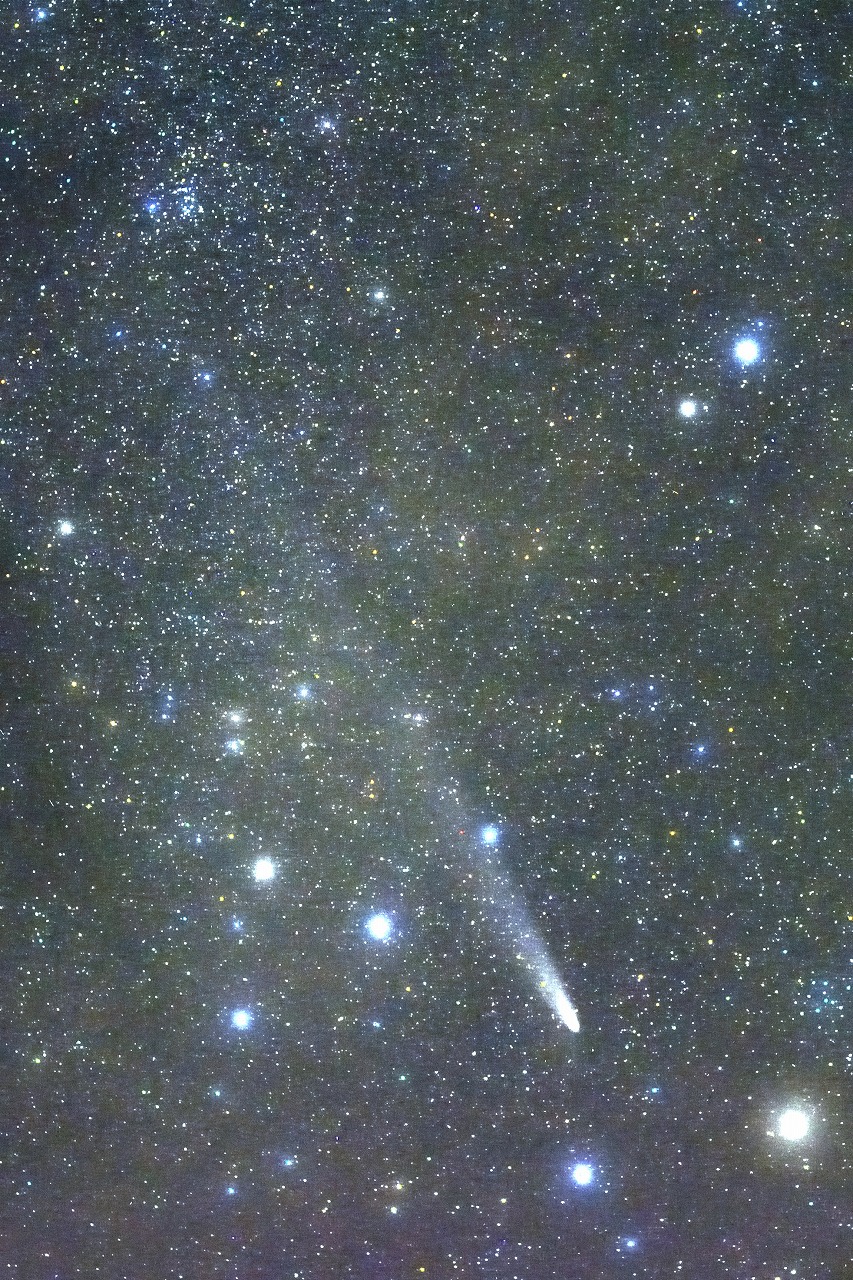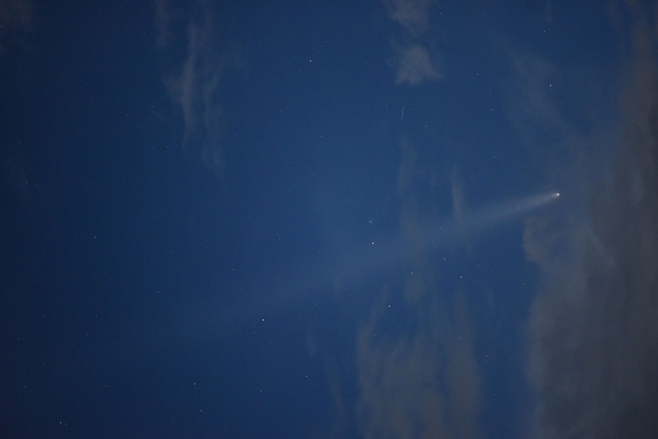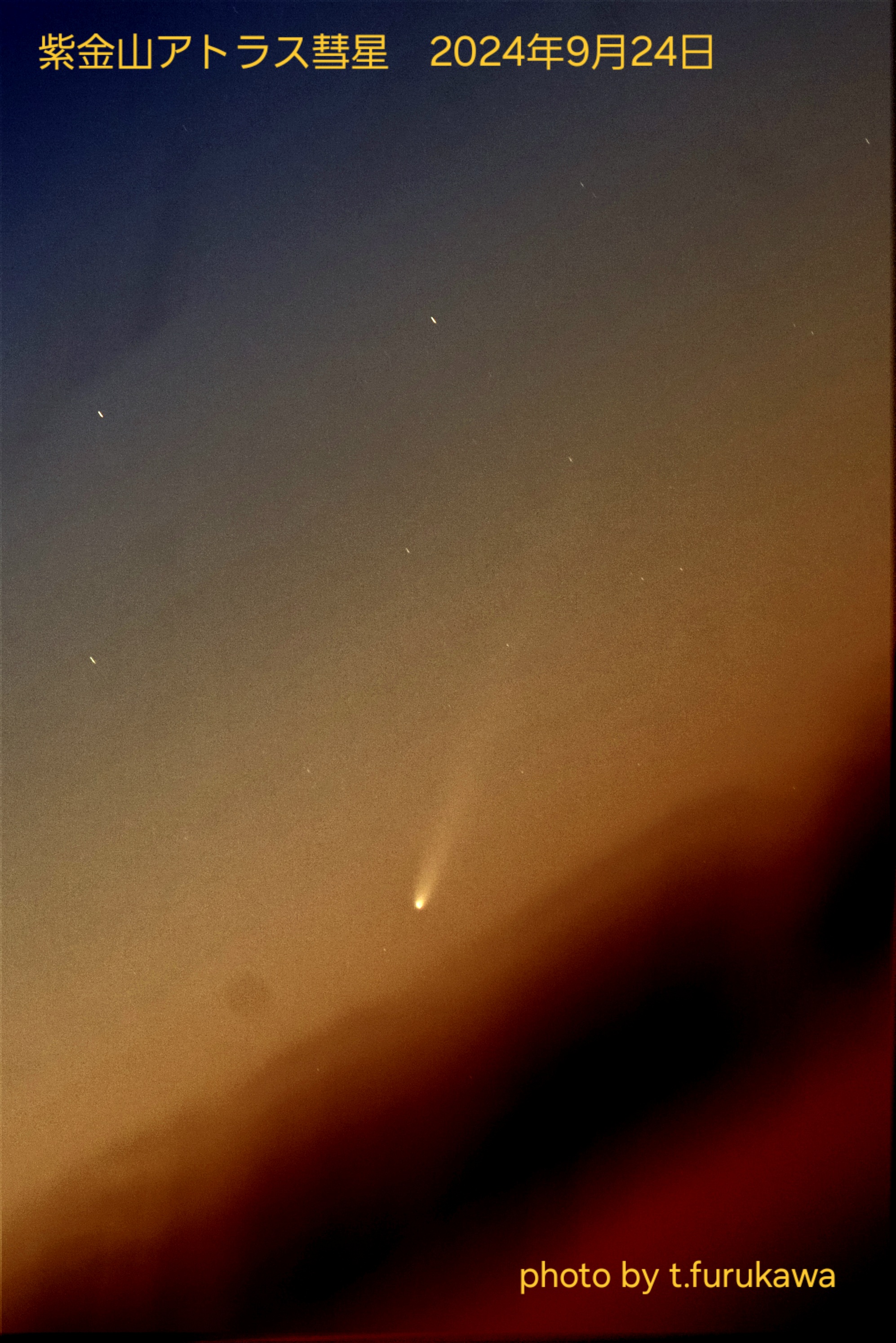 9月下旬 紫金山-アトラス彗星の観察・撮影(各自) 明け方 2023年に発見された当時からその大きさから大彗星となると期待された紫金山・アトラス彗星。 2024年9月27日に近日点を通過し、10月12日に最接近する予報であった。しかし、7月中旬頃に 彗星の核が崩壊しており、最接近前に崩壊するという予報が飛び交って悲観的な状況であった。 そんな中でしたが、MLに古川理事から報告があった。 <以下、ML報告> 9/24 撮影成功!7×50の双眼鏡で暗めの時は観察できた。3等以上はあるように感じた核に近い部分は複雑に枝分かれしていた。(古川) 9/30 太良町で撮影しました。50mmで撮影したがショボい。現時点では中望遠が良さそう。(副島) 10/01 古川撮影 写真:1 |
