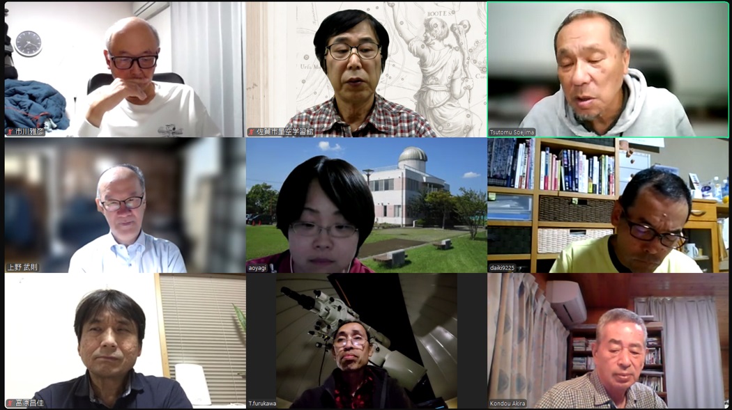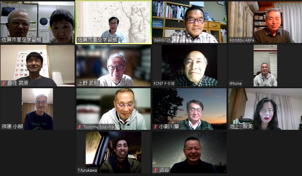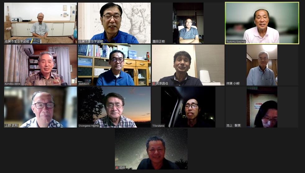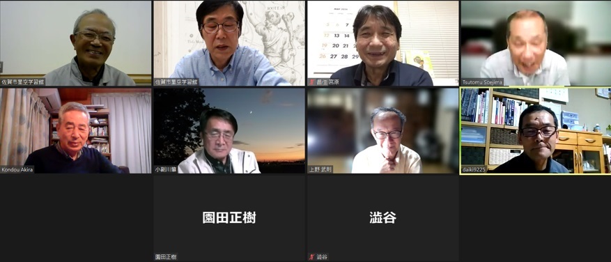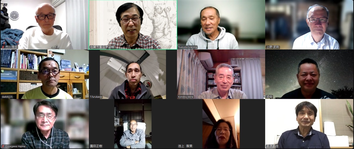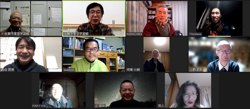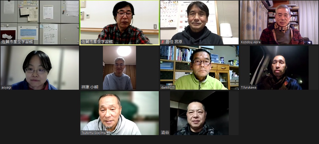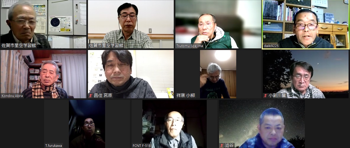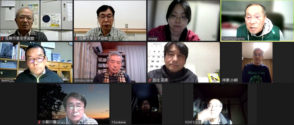 2月7日 第3回理事会&2月例会 18:30~ 第13期(2023年度)第3回理事会 18:35~19:10 議題: ◎第14期総会の日程を5月から6月開催に変更→承認 出席理事:副島、小柳、松林、早水、青柳、澁谷、宮原、古川(8名) 出席監事:近藤(1名) 写真:1 (その他:[sas理事会:145] 第13期 第3回理事会報告) 2月例会 19:35~20:50 議 題 : ◎第14期総会の日程及び総会までのスケジュール(理事会報告) ◎2月、3月の天文現象及び星空学習館イベントへの協力依頼 ◎2月の佐賀天文協会定例観測会 ◎その他 出席者 : 副島、近藤、園田、永渕、小柳、早水、澁谷、宮原、上野、古川、池上、松林 (その他:[SAS ML: #2347] 佐賀天文協会の2月例会報告) 写真:1 |